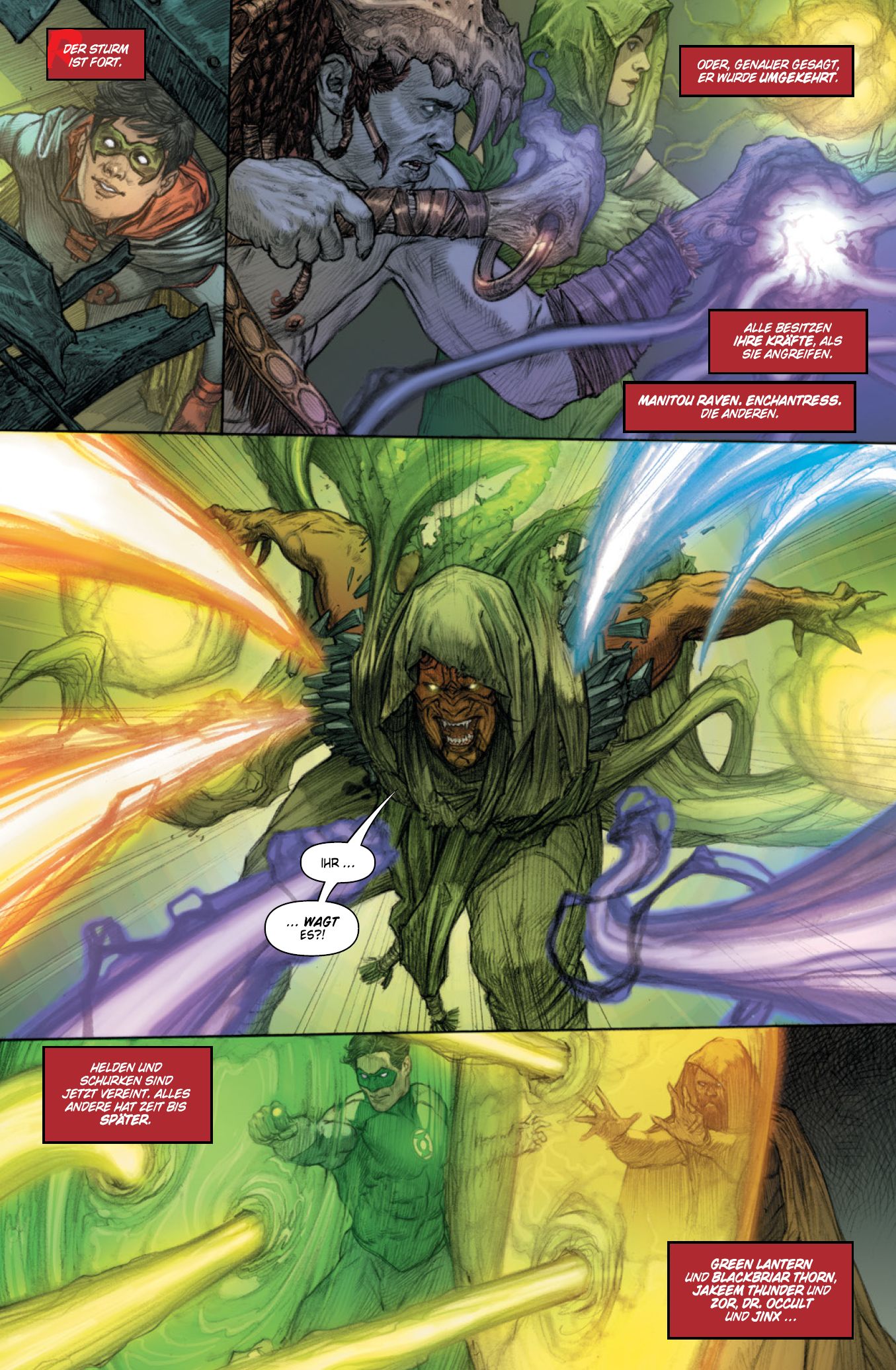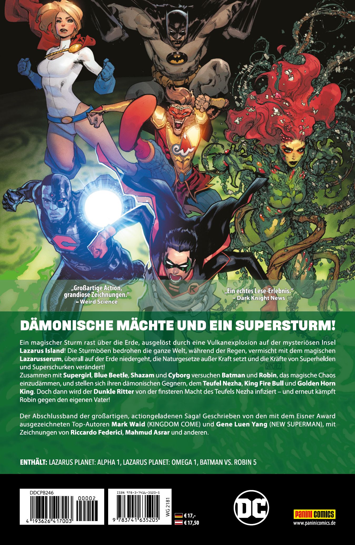 DÄMONISCHE MÄCHTE UND EIN SUPERSTURM! Ein magischer Sturm rast über die Erde, ausgelöst durch eine Vulkanexplosion auf der mysteriösen Insel Lazarus Island! Die Sturmböen bedrohen die ganze Welt, während der Regen, vermischt mit der magischen Lazarus- Essenz, überall auf der Erde niedergeht, die Naturgesetze außer Kraft setzt und die Kräfte von Superhelden und Superschurken verändert! Zusammen mit Supergirl, Blue Beetle, Shazam und Cyborg versuchen Batman und Robin, das magische Chaos einzudämmen, und stellen sich ihren dämonischen Gegnern, dem Teufel Nezha, King Fire Bull und Golden Horn King. Doch dann wird der Dunkle Ritter von der finsteren Macht des Teufels Nezha infiziert - und erneut kämpft Robin gegen den eigenen Vater! Der Abschlussband der großartigen, actiongeladenen Saga! Geschrieben von den mit dem Eisner Award ausgezeichneten Top-Autoren Mark Waid (KINGDOM COME) und Gene Luen Yang (NEW SUPERMAN), mit Zeichnungen von Riccardo Federici, Mahmud Asrar und anderen. ENTHÄLT: LAZARUS PLANET: ALPHA 1, LAZARUS PLANET: OMEGA 1, BATMAN VS. ROBIN 5