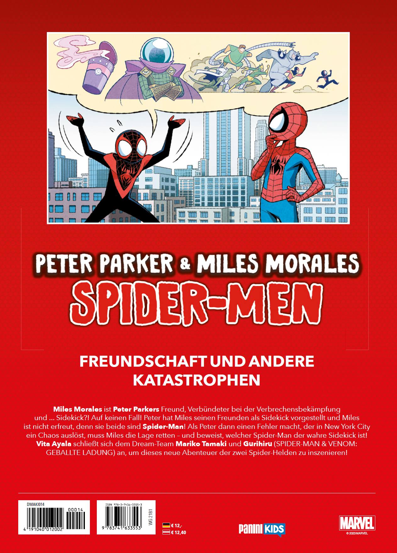 FREUNDSCHAFT UND ANDERE KATASTROPHEN Miles Morales ist Peter Parkers Freund, Namensvetter, Verbündeter bei der Verbrechensbekämpfung und ... Sidekick?! Auf keinen Fall! Peter hat Miles als Sidekick seinen Freunden vorgestellt und Miles ist nicht erfreut, denn sie sind beide Spider-Man! Als Peter dann einen Fehler macht, der in New York City ein Chaos auslöst, muss Miles die Lage retten - und beweist, welcher Spider-Man der wahre Sidekick ist! Vita Ayala schließt sich dem Dream-Team Mariko Tamaki und Gurihiru (SPIDER-MAN & VENOM: GEBALLTE LADUNG) an, um dieses neue Abenteuer der zwei Spider-Helden zu inszenieren!