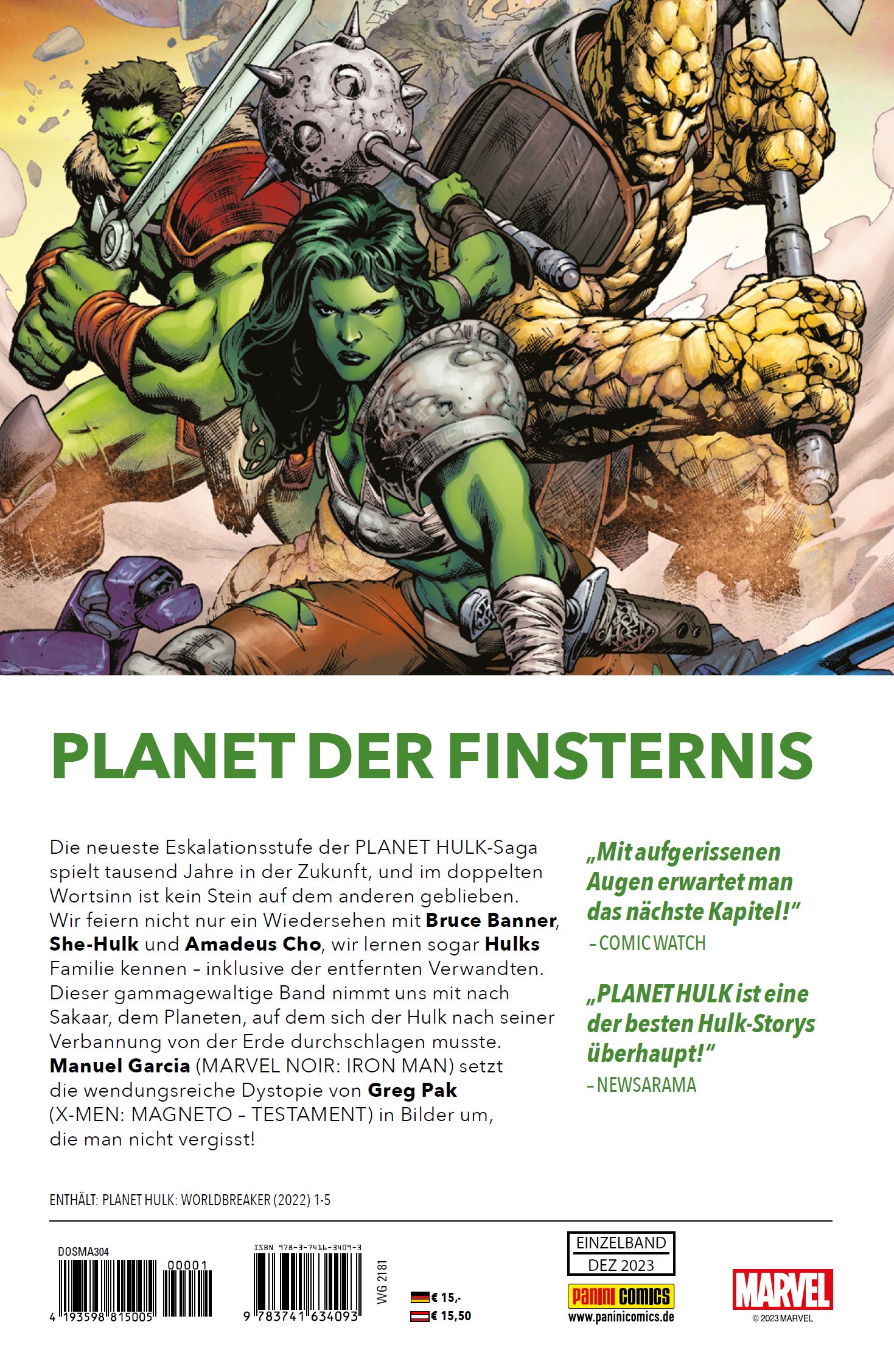 PLANET DER FINSTERNIS Die neueste Eskalationsstufe der PLANET HULK-Saga spielt tausend Jahre in der Zukunft, und im doppelten Wortsinn ist kein Stein auf dem anderen geblieben. Wir feiern nicht nur ein Wiedersehen mit Bruce Banner, She-Hulk und Amadeus Cho, wir lernen sogar Hulks Familie kennen - inklusive der entfernten Verwandten. Dieser gammagewaltige Band nimmt uns mit nach Sakaar, dem Planeten, auf dem sich der Hulk nach seiner Verbannung von der Erde durchschlagen musste. Manuel Garcia (MARVEL NOIR: IRON MAN) setzt die wendungsreiche Dystopie von Greg Pak (X-MEN: MAGNETO - TESTAMENT) in Bilder um, die man nicht vergisst!ENTHÄLT: PLANET HULK: WORLDBREAKER (2022) 1-5