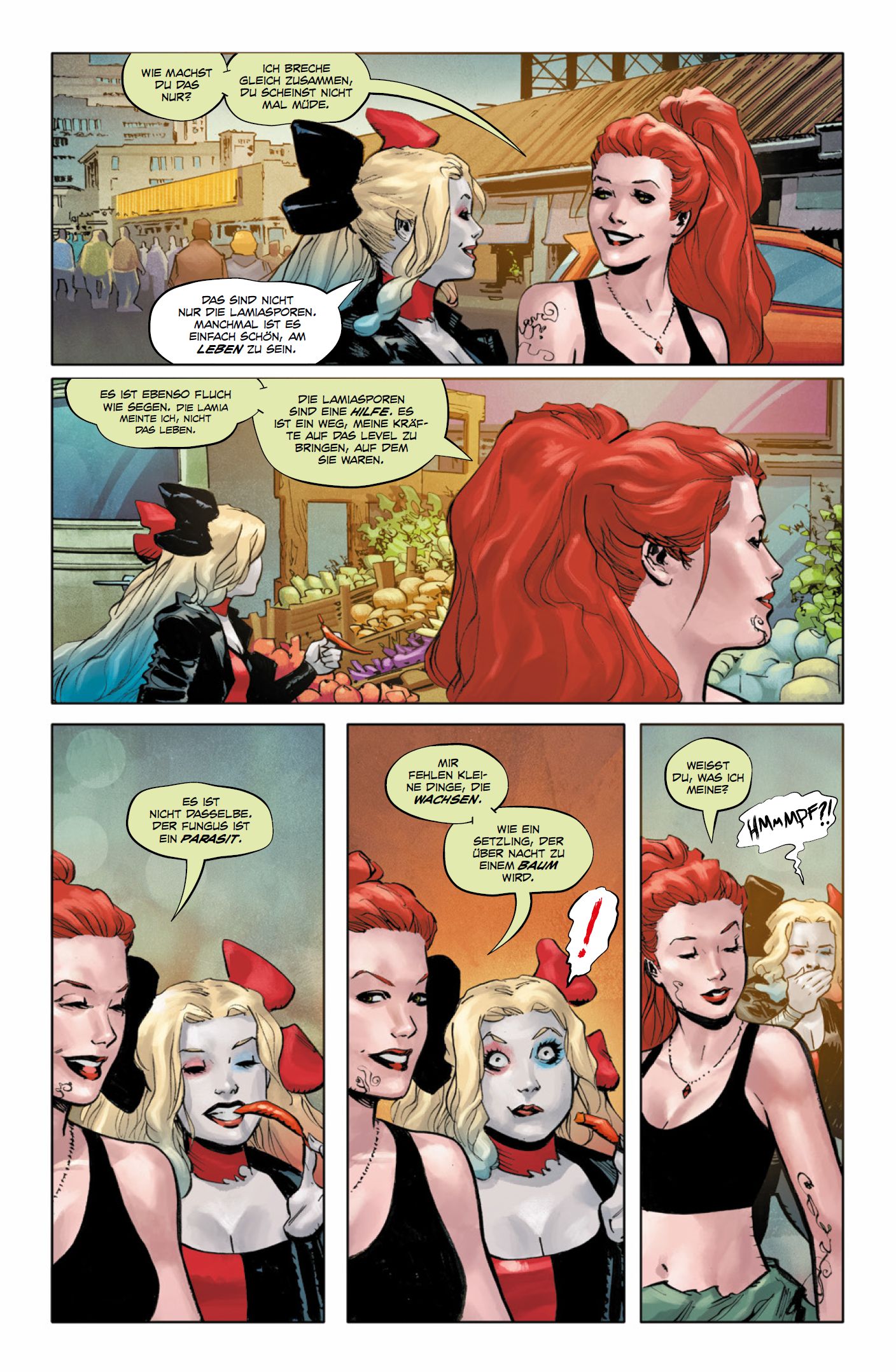 PFLANZENFLÜSTERIN von Christian Endres Einst war Dr. Pamela Lillian Isley eine Biologin – dann wurde sie zur giftigen Pflanzenflüsterin, Superschurkin, Ökoterroristin und gelegentlichen Antiheldin Poison Ivy, die eine starke Verbindung zum Grün hat, der gemeinsamen Sphäre aller Pflanzen. Doch sie wurde auch die beste Freundin der Clownprinzessin Harley Quinn, ehe die beiden sich sogar ineinander verliebten. Zuletzt existierten mehrere Inkarnationen von Pam: die überlegene Queen Ivy und die naive Ivy. Am Ende des Batman-Events Fear State wurden diese beiden Versionen wieder vereint, und Pam erlangte und verlor unglaubliche Macht. Daraufhin erklärte Pam ihrer geliebten Clownprinzessin, dass sie getrennte Wege gehen müssten. Pams Pfad führte zu dieser neuen Comic-Soloserie. Eigentlich waren nur eine US-Miniserie und somit ein Einzelband geplant, doch die herausragende Qualität und das entsprechende Echo machten ein üppiges Wachstum möglich: POISON IVY von G. Willow Wilson, Marcio Takara und Co. erhielt nicht nur einen zweiten Storybogen, den wir in diesem Band präsentieren, sondern wurde zu einer fortlaufenden Serie! Aber rekapitulieren wir zunächst noch mal, was bisher geschah: Anfangs war Ivy einmal mehr ausgezogen, um die Menschheit auszurotten, um so den Planeten zu retten. Auf ihrem Roadtrip traf Pam allerdings immer wieder auf nette Menschen, die im Einklang mit der Natur lebten. Doch sie wurde auch von ihrer Vergangenheit eingeholt, und zwar in Form von Dr. Jason Woodrue, dem bösen Floronic Man – dem Mann, der sie einst in Poison Ivy verwandelt hatte. Ihr Kampf endete damit, dass Ivy den zum Pflanzenmonster gewordenen Woodrue verspeiste und so aus der Welt schaffte (was jedoch nicht für all seine gefährlichen Lamiasporen-Geschöpfe gilt). Zudem schrieb Ivy immer wieder Briefe an Harley. Im letzten teilte Pam ihrer Ex mit, dass sie Harley, die sich inzwischen mit der Bat-Familie verbündet hatte, immer lieben werde, egal was geschehe, und egal was Ivy tun müsse. Bis ans Ende der Welt. Weshalb Harley nun auf dem Weg zu ihrer grünen Liebsten ist …