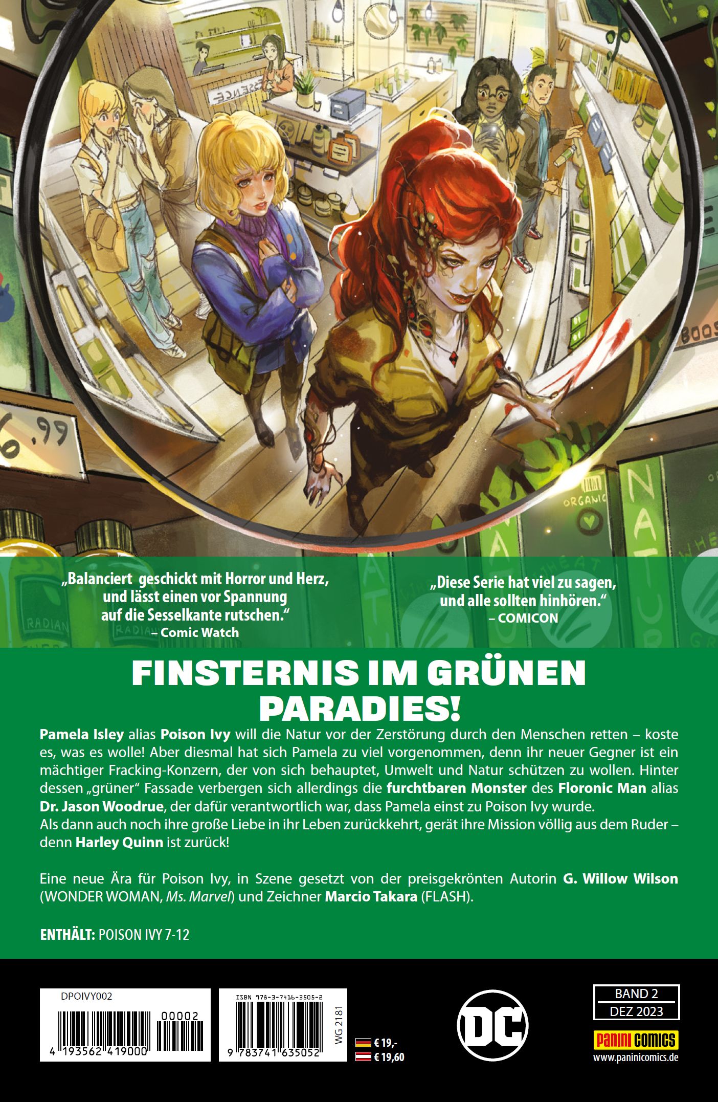 FINSTERNIS IM GRÜNEN PARADIES! Pamela Isley alias Poison Ivy will die Natur vor der Zerstörung durch den Menschen retten - koste es, was es wolle! Aber diesmal hat sich Pamela zu viel vorgenommen, denn ihr neuer Gegner ist ein mächtiger Fracking-Konzern, der von sich behauptet, Umwelt und Natur schützen zu wollen, hinter dessen "grüner" Fassade sich allerdings furchtbare Monster verbergen - Monster des Floronic Man, Dr. Jason Woodrue, der dafür verantwortlich war, dass Pamela einst zu Poison Ivy wurde. Als dann auch noch ihre große Liebe in ihr Leben zurückkehrt, gerät ihre Mission völlig aus dem Ruder - denn Harley Quinn ist zurück! Eine neue Ära für Poison Ivy, in Szene gesetzt von der preisgekrönten Autorin G. Willow Wilson (WONDER WOMAN, Ms. Marvel) und Zeichner Marcio Takara (FLASH). ENTHÄLT: POISON IVY 7-12