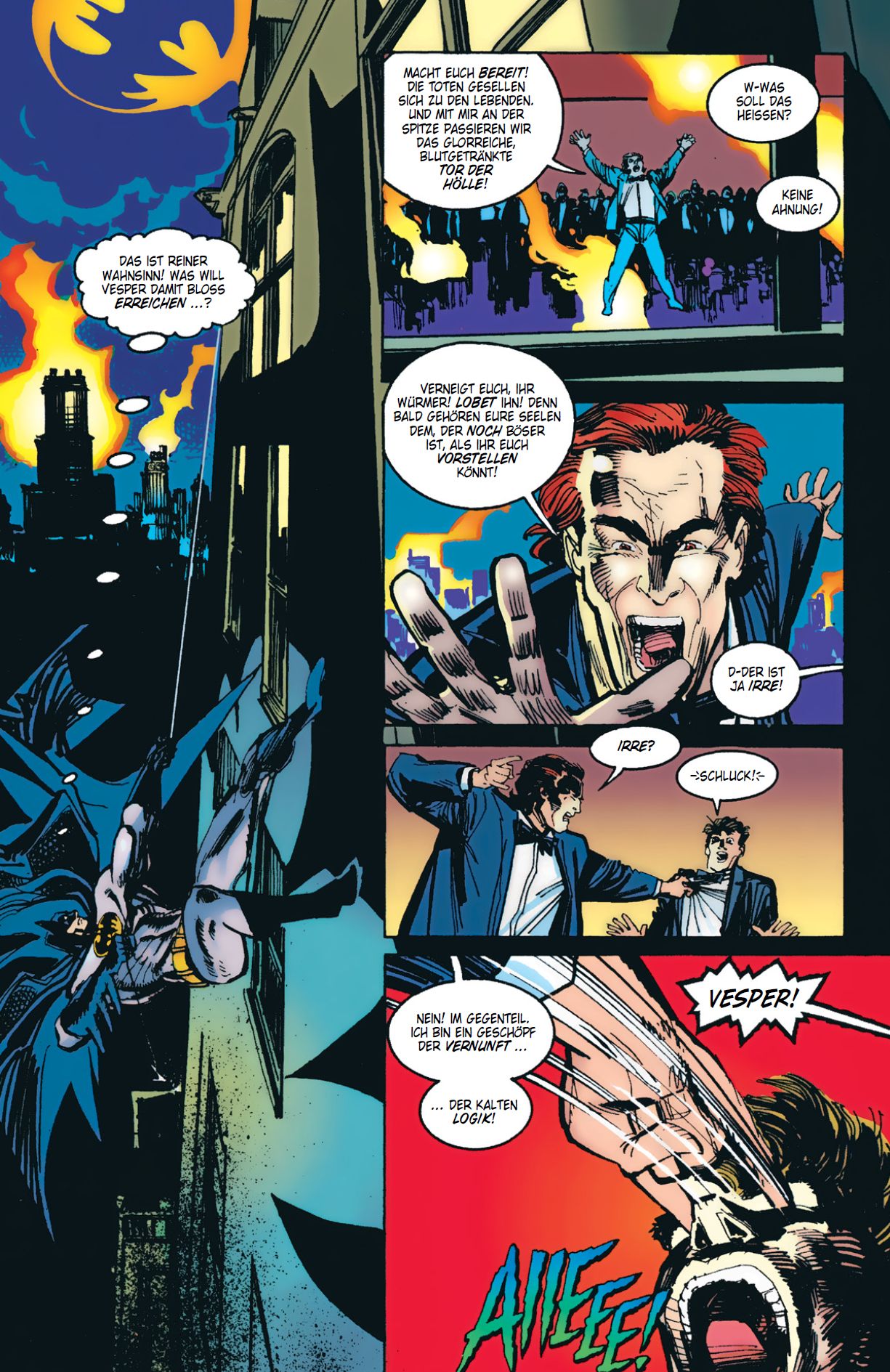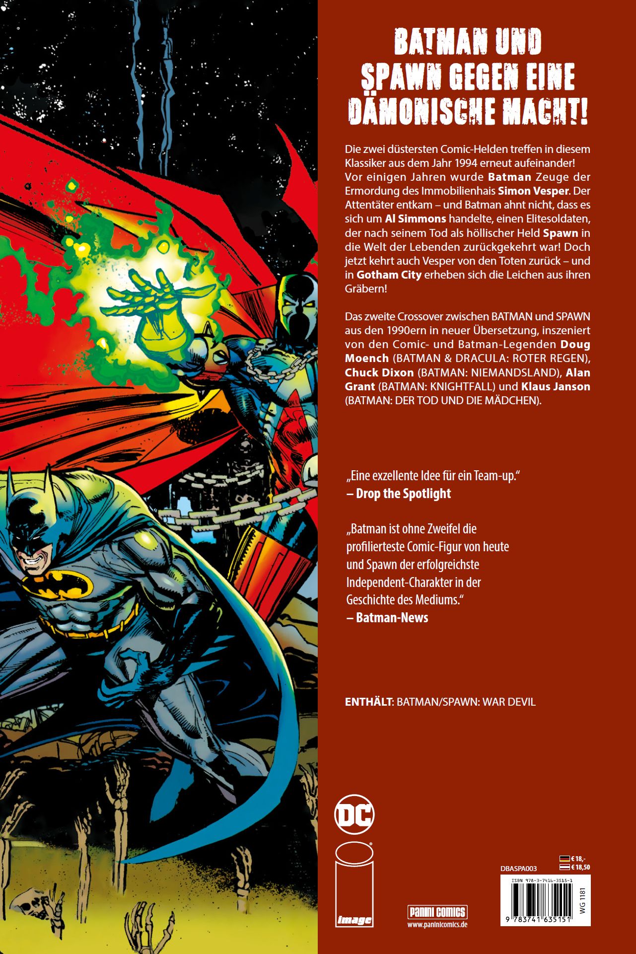 BATMAN UND SPAWN GEGEN EINE DÄMONISCHE MACHT! Die zwei düstersten Comic-Helden treffen in diesem Klassiker aus dem Jahr 1994 erneut aufeinander! Vor einigen Jahren wurde Batman Zeuge der Ermordung des Immobilienhais Simon Vesper. Der Attentäter entkam - und Batman ahnt nicht, dass es sich um Al Simmons handelte, einen Elitesoldaten, der nach seinem Tod als höllischer Held Spawn in die Welt der Lebenden zurückgekehrt war! Doch jetzt kehrt auch Vesper von den Toten zurück - und in Gotham City erheben sich die Leichen aus ihren Gräbern! Das zweite Crossover zwischen BATMAN und SPAWN aus den 1990ern in neuer Übersetzung, inszeniert von den Comic- und Batman-Legenden Doug Moench (BATMAN & DRACULA: ROTER REGEN), Chuck Dixon (BATMAN: NIEMANDSLAND), Alan Grant (BATMAN: KNIGHTFALL) und Klaus Janson (BATMAN: DER TOD UND DIE MÄDCHEN). ENTHÄLT: BATMAN/SPAWN: WAR DEVIL