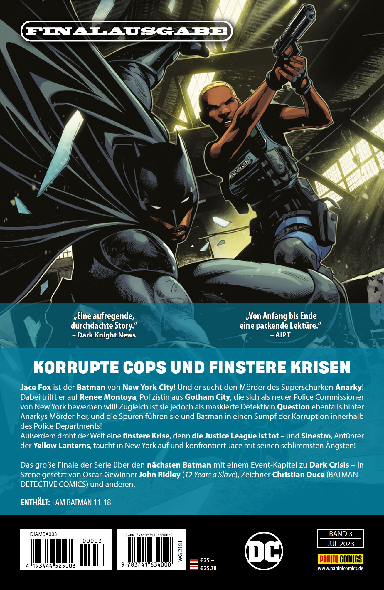 KORRUPTE COPS UND FINSTERE KRISEN Jace Fox ist der Batman von New York City! Und er sucht den Mörder des Superschurken Anarky! Dabei trifft er auf Renee Montoya, Polizistin aus Gotham City, die sich als neuer Police Commissioner von New York bewerben will! Zugleich ist sie jedoch als maskierte Detektivin Question ebenfalls hinter Anarkys Mörder her, und die Spuren führen sie und Batman in einen Sumpf der Korruption innerhalb des Police Departments! Außerdem droht der Welt eine finstere Krise, denn die Justice League ist tot - und Sinestro, Anführer der Yellow Lanterns, taucht in New York auf und konfrontiert Jace mit seinen schlimmsten Ängsten! Das große Finale der Serie über den nächsten Batman mit einem Event-Kapitel zu Dark Crisis - in Szene gesetzt von Oscar-Gewinner John Ridley (12 Years a Slave), Zeichner Christian Duce (BATMAN - DETECTIVE COMICS) und anderen.ENTHÄLT: I AM BATMAN 11-18