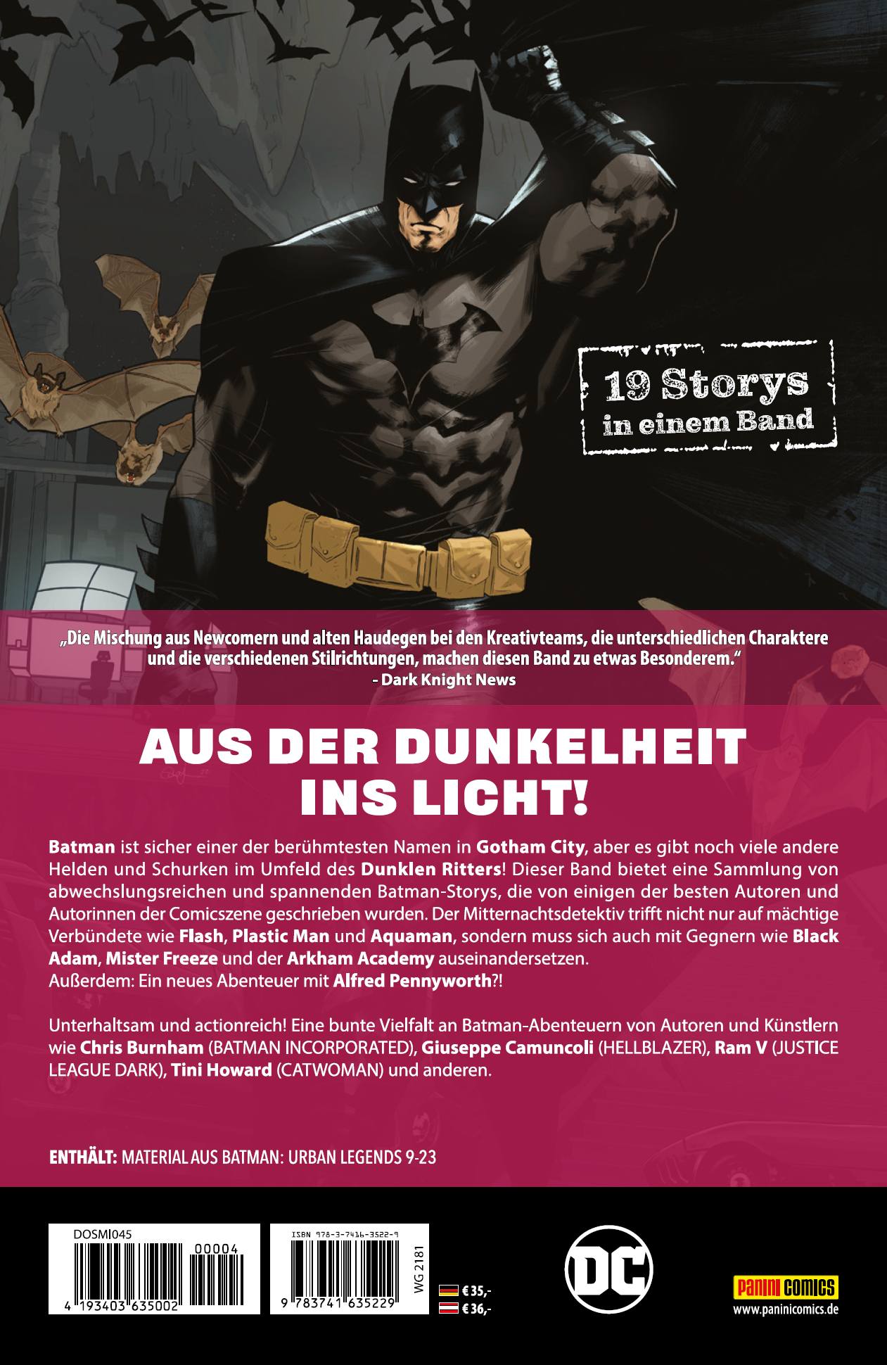 AUS DER DUNKELHEIT INS LICHT! Batman ist sicher einer der berühmtesten Namen in Gotham City, aber es gibt noch viele andere Helden und Schurken im Umfeld des Dunklen Ritters! Dieser Band bietet eine Sammlung von abwechslungsreichen und spannenden Batman-Storys, die von einigen der besten Autoren und Autorinnen der Comicszene geschrieben wurden. Der Mitternachtsdetektiv trifft nicht nur auf mächtige Verbündete wie Flash, Plastic Man und Aquaman, sondern muss sich auch mit Gegnern wie Black Adam, Mister Freeze und der Arkham Academy auseinandersetzen. Außerdem: Ein neues Abenteuer mit Alfred Pennyworth?! Unterhaltsam und actionreich! Eine bunte Vielfalt an Batman-Abenteuern von Autoren und Künstlern wie Chris Burnham (BATMAN INCORPORATED), Giuseppe Camuncoli (HELLBLAZER), Ram V (JUSTICE LEAGUE DARK), Tini Howard (CATWOMAN) und anderen. ENTHÄLT: MATERIAL AUS BATMAN: URBAN LEGENDS 9-2319 Storys in einem Band