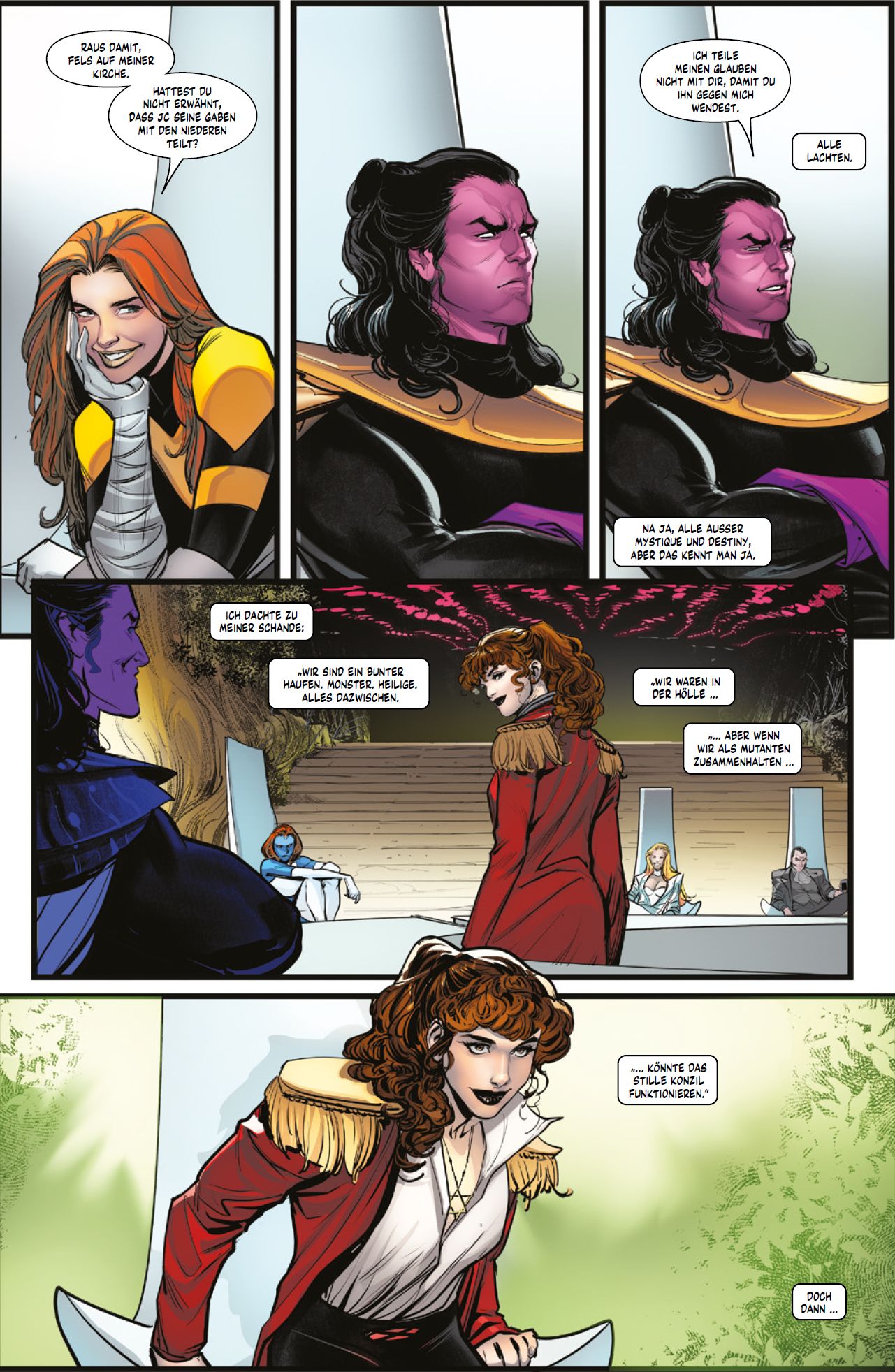 VORWORT von Thomas Witzler Ein schwerer Konflikt hat die Erde an den Rand des Abgrunds geführt. Druig, der aktuelle Anführer der gottgleichen Eternals, hat te das Volk der Mutanten als einen Fehler der Natur bezeichnet und ihnen die Daseinsberechtigung abgesprochen. Nachdem er die Mutantennation Krakoa attackiert hatte, kam es zum Krieg zwischen beiden Spezies. Doch ein Teil der Eternals lehnte Druigs radikales Vorgehen ab. Mit ihrer Hilfe versuchten Avengers und X-Men, ein Ende der Aggressionen herbeizuführen. Alles wurde nur noch schlimmer. Seit Kurzem nutzten die Avengers den Leichnam eines Celestials namens Progenitor als Hauptquartier. In der Hoffnung, Druig den Wind aus den Segeln zu nehmen, erweckten sie den mächtigen Weltraumgott wieder zum Leben. Aber als der Progenitor den Zustand des Planeten sah, erklärte er, binnen 24 Stunden ein Urteil über seine Bewohner zu fällen. Sollte die Menschheit nicht seinen Erwartungen genügen, werde er die Erde zerstören. Panik griff um sich. Captain America versuchte vergeblich, die Massen zu beruhigen. New Yorks Bürgermeister Luke Cage, Mystique, Destiny und Charles Xavier wurden vom Progenitor als unwürdig erachtet. Kitty Pryde, Ms. Marvel und Dr. Doom hielten seinen hohen Anforderungen stand. Während die Uhr im Hintergrund tickte, versuchte Druig, aus dem Wirrwarr Kapital zu schlagen. In der Folge traf Magneto auf den nahezu unbezwingbaren Eternal Uranos. Der Kampf nahm einen bitteren Verlauf. Zwar wurde Uranos letztlich besiegt, der Herr des Magnetismus bezahlte den Triumph jedoch mit seinem Leben. Kurz darauf lief das Ultimatum ab. Der Progenitor hatte sich entschieden und die Bevölkerung der Erde zum Tode verurteilt. Das Massensterben hat begonnen. Aber ein Mutant weigert sich, die Hoffnung aufzugeben. Wird Nightcrawler in dieser finsteren Stunde eine Möglichkeit finden, den Progenitor umzustimmen? Derweil lauer t in den eigenen Reihen von Krakoas Stillem Konzil ein weiteres existenzielles Problem, das die ganze Nation bedroht.