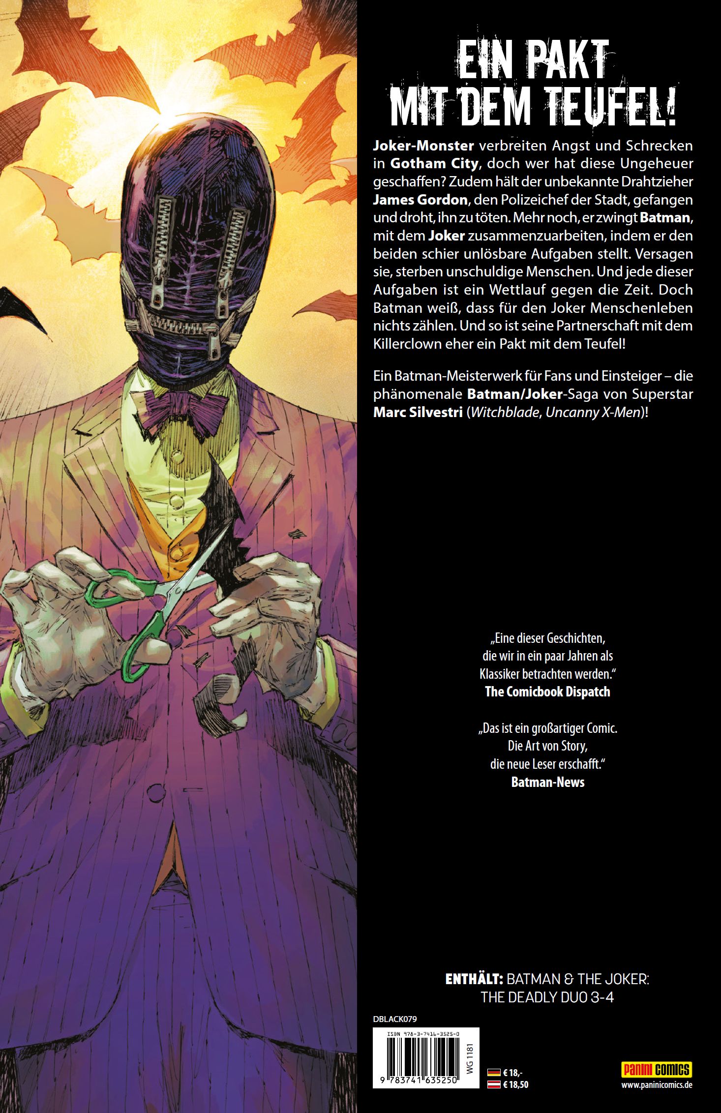 EIN PAKT MIT DEM TEUFEL! Joker-Monster verbreiten Angst und Schrecken in Gotham City, doch wer hat diese Ungeheuer geschaffen? Zudem hält der unbekannte Drahtzieher James Gordon, den Polizeichef der Stadt, gefangen und droht, ihn zu töten. Mehr noch, er zwingt Batman, mit dem Joker zusammenzuarbeiten, indem er den beiden schier unlösbare Aufgaben stellt. Versagen sie, sterben unschuldige Menschen. Und jede dieser Aufgaben ist ein Wettlauf gegen die Zeit. Doch Batman weiß, dass für den Joker Menschenleben nichts zählen. Und so ist seine Partnerschaft mit dem Killerclown eher ein Pakt mit dem Teufel! Ein Batman-Meisterwerk für Fans und Einsteiger - die phänomenale Batman/Joker-Saga von Superstar Marc Silvestri (Witchblade, Uncanny X-Men)! ENTHÄLT: BATMAN & THE JOKER: THE DEADLY DUO 3-4