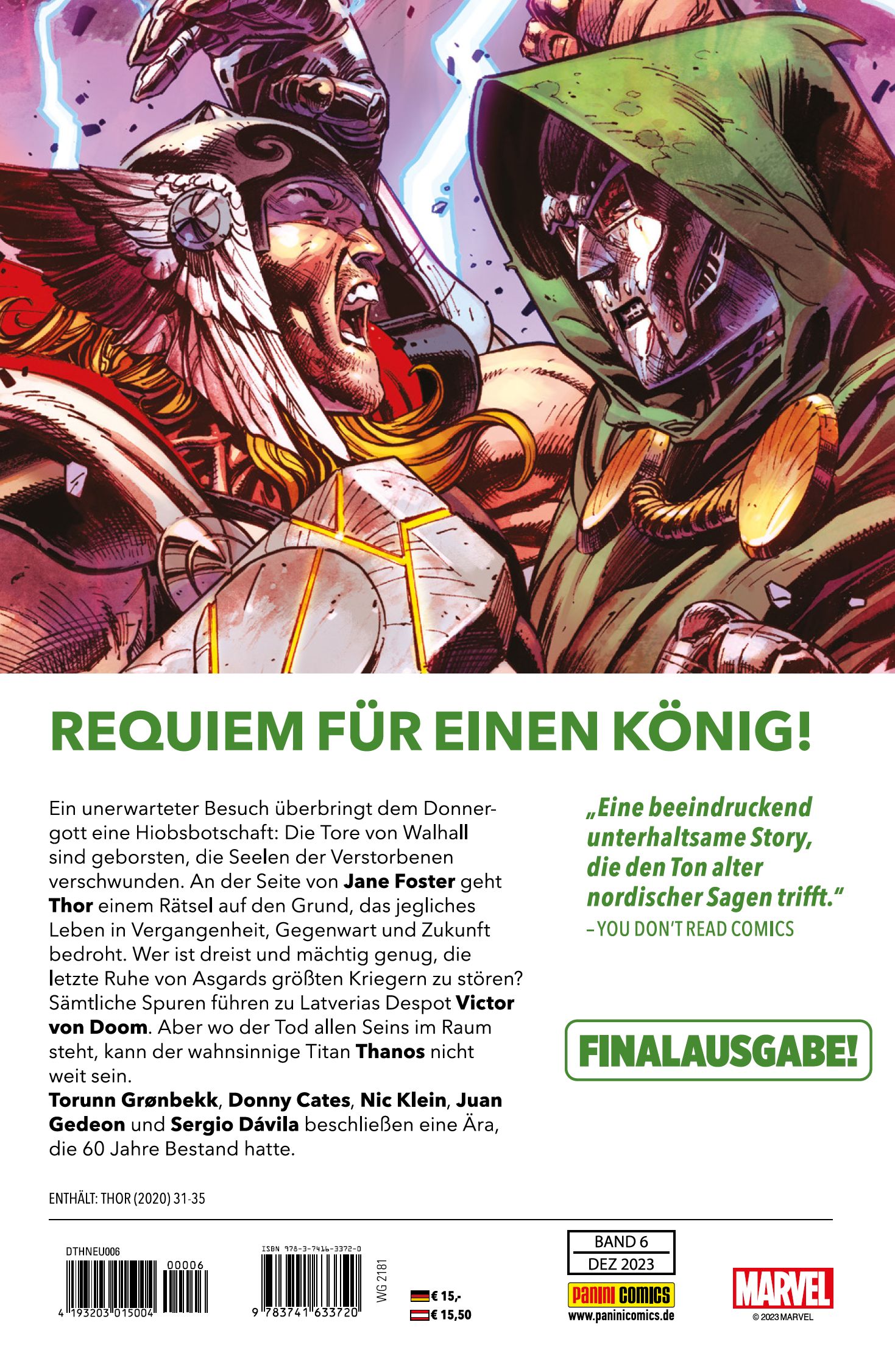 REQUIEM FÜR EINEN KÖNIG! Ein unerwarteter Besuch überbringt dem Donnergott eine Hiobsbotschaft: Die Tore von Walhall sind geborsten, die Seelen der Verstorbenen verschwunden. An der Seite von Jane Foster geht Thor einem Rätsel auf den Grund, das jegliches Leben in Vergangenheit, Gegenwart und Zukunft bedroht. Wer ist dreist und mächtig genug, die letzte Ruhe von Asgards größten Kriegern zu stören? Sämtliche Spuren führen zu Latverias Despot Victor von Doom. Aber wo der Tod allen Seins im Raum steht, kann der wahnsinnige Titan Thanos nicht weit sein. Torunn Grønbekk, Donny Cates, Nic Klein, Juan Gedeon und Sergio Dávila beschließen eine Ära, die 60 Jahre Bestand hatte. ENTHÄLT: THOR (2020) 31-35FINALAUSGABE!