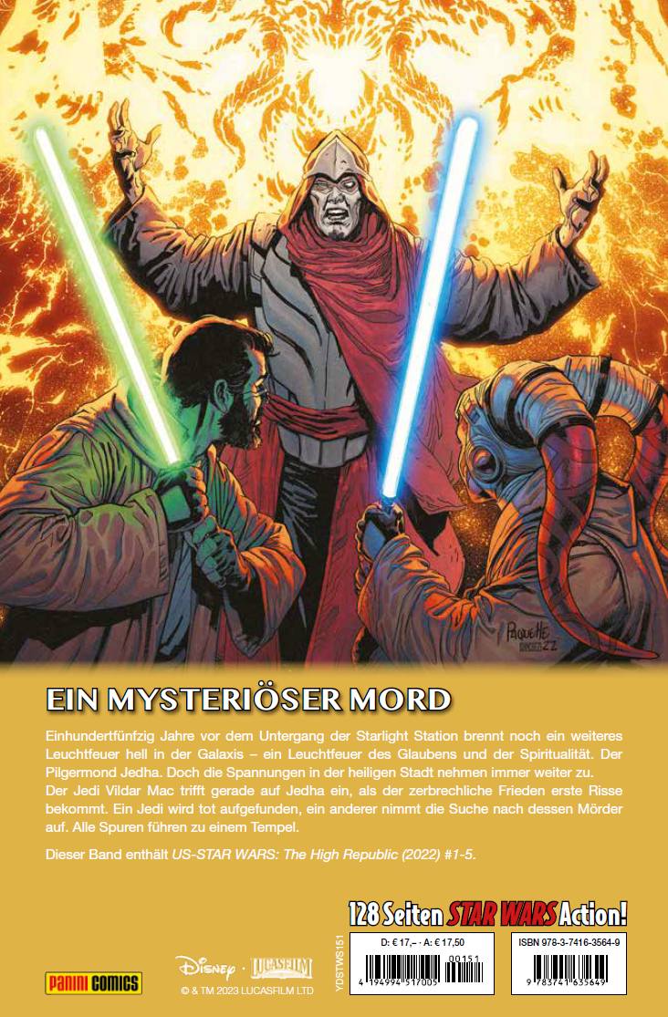 EIN MYSTERIOSER MORD Einhundertfünfzig Jahre vor dem Untergang der Starlight Station brennt noch ein weiteres Leuchtfeuer hell in der Galaxis - ein Leuchtfeuer des Glaubens und der Spiritualität. Der Pilgermond Jedha. Doch die Spannungen in der heiligen Stadt nehmen immer weiter zu. Der Jedi Vildar Mac trifft gerade auf Jedha ein, als der zerbrechliche Frieden erste Risse bekommt. Ein Jedi wird tot aufgefunden, ein anderer nimmt die Suche nach dessen Mörder auf. Alle Spuren führen zu einem Tempel. Dieser Band enthält US-STAR WARS: The High Republic (2022) #1-5.