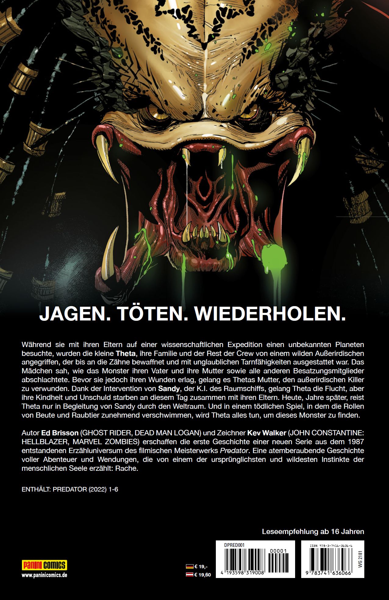 JAGEN. TÖTEN. WIEDERHOLEN. Während sie mit ihren Eltern auf einer wissenschaftlichen Expedition einen unbekannten Planeten besuchte, wurden die kleine Theta, ihre Familie und der Rest der Crew von einem wilden Außerirdischen angegriff en, der bis an die Zähne bewaff net und mit unglaublichen Tarnfähigkeiten ausgestattet war. Das Mädchen sah, wie das Monster ihren Vater und ihre Mutter sowie alle anderen Besatzungsmitglieder abschlachtete. Bevor sie jedoch ihren Wunden erlag, gelang es Thetas Mutter, den außerirdischen Killer zu verwunden. Dank der Intervention von Sandy, der K.I. des Raumschiff s, gelang Theta die Flucht, aber ihre Kindheit und Unschuld starben an diesem Tag zusammen mit ihren Eltern. Heute, Jahre später, reist Theta nur in Begleitung von Sandy durch den Weltraum. Und in einem tödlichen Spiel, in dem die Rollen von Beute und Raubtier zunehmend verschwimmen, wird Theta alles tun, um dieses Monster zu finden. Autor Ed Brisson (GHOST RIDER, DEAD MAN LOGAN) und Zeichner Kev Walker (JOHN CONSTANTINE: HELLBLAZER, MARVEL ZOMBIES) erschaff en die erste Geschichte einer neuen Serie aus dem 1987 entstandenen Erzähluniversum des fi lmischen Meisterwerks Predator. Eine atemberaubende Geschichte voller Abenteuer und Wendungen, die von einem der ursprünglichsten und wildesten Instinkte der menschlichen Seele erzählt: Rache. ENTHÄLT: PREDATOR (2022) 1-6