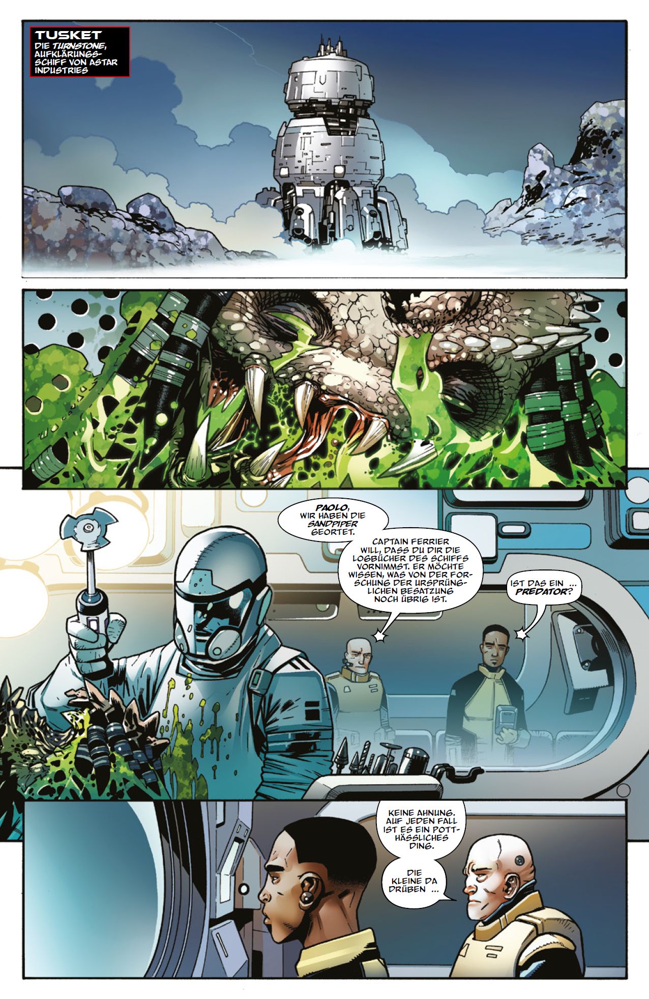 VORWORT von Francesco Tedeschi „Wenn es blutet, können wir es töten.“ Mit diesen lapidaren Worten blickt Dutch auf die grüne Pfütze, die sein Feind zurückgelassen hat, und erkennt, dass die Kreatur, der er und sein Team von Elitesoldaten gegenüberstehen, nicht unsterblich ist. Waffen können sie also stoppen, auch wenn es nicht einfach wird: Das außerirdische Monster ist schnell, wendig, schwer bewaffnet, extrem intelligent und vor allem will es Dutch und sein Team einzeln töten ... oder bei dem Versuch dabei sterben. Wir schreiben das Jahr 1987 und der Film heißt natürlich Predator. Geschrieben von zwei Debüt-Drehbuchautoren, den Brüdern Jim und John Thomas, war der Film sofort ein voller Erfolg. Die Gründe liegen im schnellen Tempo, den perfekt in ihre Rollen als Söldner auf einer Mission platzierten Charakteren, der tropischen Umgebung ... und vor allem im Bösewicht der Geschichte. Der Predator ist ein Bösewicht, wie man ihn noch nie zuvor gesehen hat. Ein Außerirdischer mit Netztop (!), einem gruseligen Gesicht – wenn wir von einem Gesicht sprechen können – ähnlich dem einer schrecklichen Weltraumkrabbe, einer unglaublichen strategischen Intelligenz und einer erzählerisch schillernden Motivation: Er jagt für den Sport. Bis dahin zeigten Filme Aliens, die die Menschheit aus verschiedenen Gründen angriffen (die Kolonisierung von Außerirdischen in Der Krieg der Welten, die Reproduktion des Xenomorphs in Alien). Aber der Besucher, der auf die Erde kommt, um einen würdigen Gegner auszuwählen und seiner Sammlung einen Totenschädel hinzuzufügen, ist ein neues und unglaubliches Erzählmittel. Der Predator hat einen sehr strengen Kodex, den er respektiert, bis er buchstäblich stirbt: Seine Beute muss ein gültiger Gegner sein, vollkommen gesund und in der Lage, sich zu wehren. Kurz gesagt, wenn ein Raubtier sein Ziel auswählt, könnte dieses Ziel das Blatt der Jagd wenden und zum Raubtier werden. Ein ebenso einfacher wie effektiver Mechanismus, der in den vier Fortsetzungen des Films wiederkehrt – und die bemerkenswerte letzte hat eine weibliche Protagonistin, genau wie die Geschichte, die ihr gleich lesen werdet. Das ist der Hauptgrund, warum der Predator eine wahre Legende des Sci-Fiund Action-Kinos ist. Jetzt sind mehr als 35 Jahre vergangen, und das Alien in der Netzweste erschien in sechs weiteren Filmen (darunter zwei der Parallelmarke Alien vs. Predator) und in einer großen Anzahl von Videospielen, Romanen und Comics. Und heute entführen uns Autor Ed Brisson und Zeichner Kev Walker zurück in dieses Erzähluniversum, um uns eine atemberaubende Geschichte zu präsentieren, die einmal mehr auf der Polarität zwischen Beute und Raubtier basiert. Aber in diesem Fall beginnt die Jagd anders. Diesmal ist das Raubtier nicht der Predator.