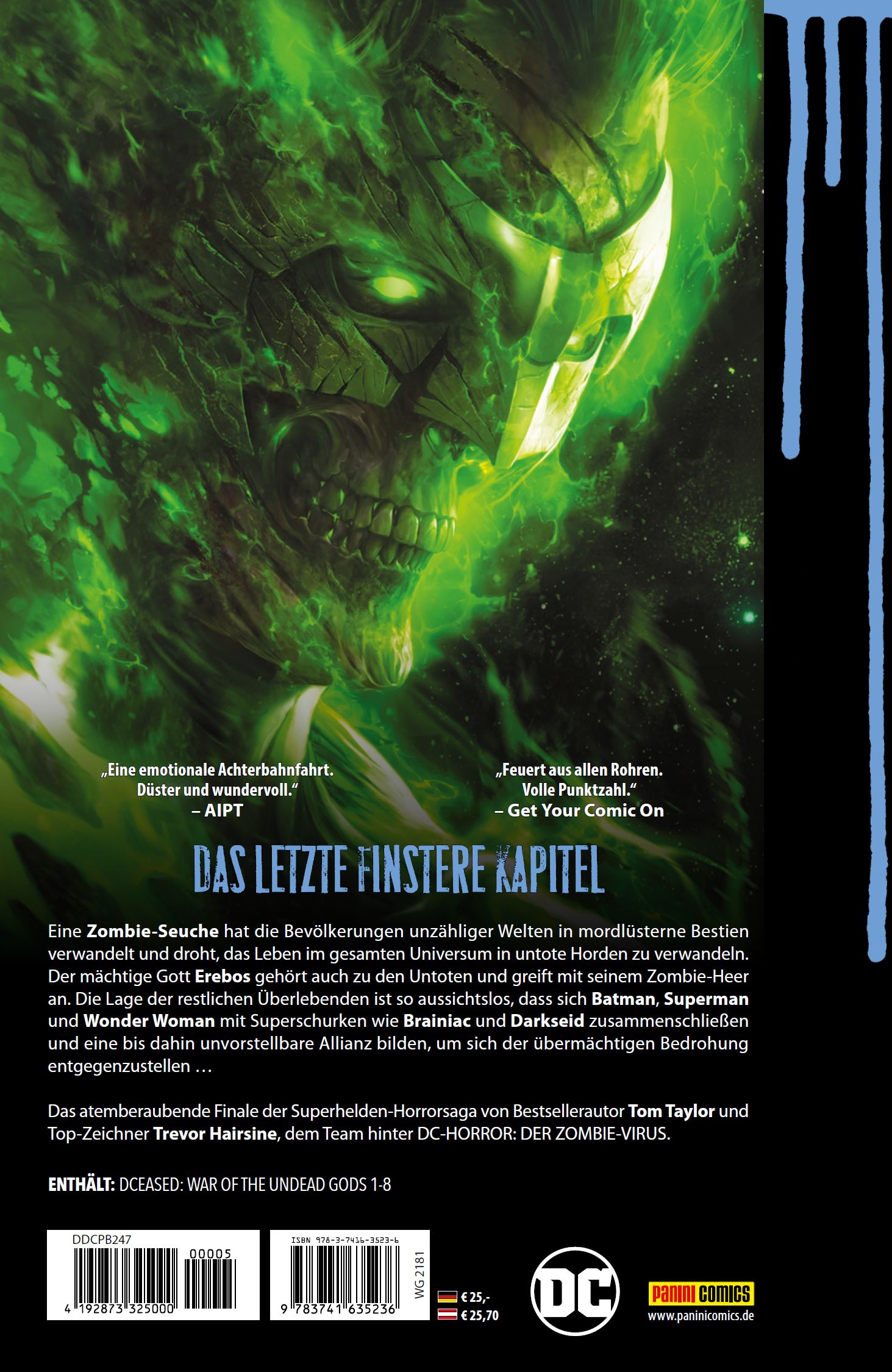 DAS LETZTE FINSTERE KAPITEL Eine Zombie-Seuche hat die Bevölkerungen unzähliger Welten in mordlüsterne Bestien verwandelt und droht, das Leben im gesamten Universum in untote Horden zu verwandeln. Der mächtige Gott Erebos gehört auch zu den Untoten und greift mit seinem Zombie-Heer an. Die Lage der restlichen Überlebenden ist so aussichtslos, dass sich Batman, Superman und Wonder Woman mit Superschurken wie Brainiac und Darkseid zusammenschließen und eine bis dahin unvorstellbare Allianz bilden, um sich der übermächtigen Bedrohung entgegenzustellen ... Das atemberaubende Finale der Superhelden-Horrorsaga von Bestsellerautor Tom Taylor und Top-Zeichner Trevor Hairsine, dem Team hinter DC-HORROR: DER ZOMBIE-VIRUS. ENTHÄLT: DCEASED: WAR OF THE UNDEAD GODS 1-8