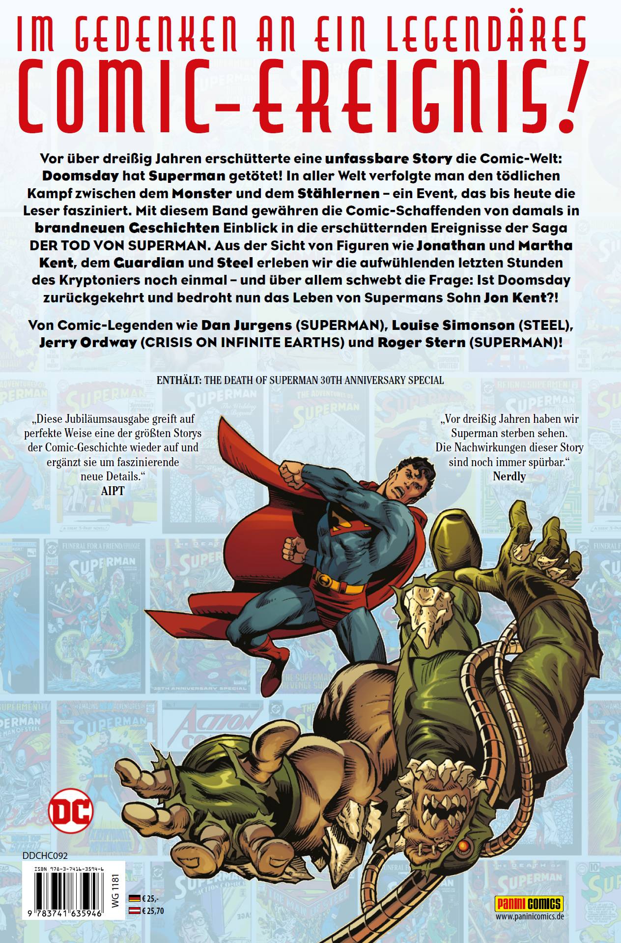 IM GEDENKEN AN EIN LEGENDÄRES COMIC-EREIGNIS! Vor über dreißig Jahren erschütterte eine unfassbare Story die Comic-Welt: Doomsday hat Superman getötet! In aller Welt verfolgte man den tödlichen Kampf zwischen dem Monster und dem Stählernen - ein Event, das bis heute die Leser fasziniert. Mit diesem Band gewähren die Comic-Schaffenden von damals in brandneuen Geschichten Einblick in die erschütternden Ereignisse der Saga DER TOD VON SUPERMAN. Aus der Sicht von Figuren wie Jonathan und Martha Kent, dem Guardian und Steel erleben wir die aufwühlenden letzten Stunden des Kryptoniers noch einmal - und über allem schwebt die Frage: Ist Doomsday zurückgekehrt und bedroht nun das Leben von Supermans Sohn Jon Kent?! Von Comic-Legenden wie Dan Jurgens (SUPERMAN), Louise Simonson (STEEL), Jerry Ordway (CRISIS ON INFINITE EARTHS) und Roger Stern (SUPERMAN)! ENTHÄLT: THE DEATH OF SUPERMAN 30TH ANNIVERSARY SPECIAL