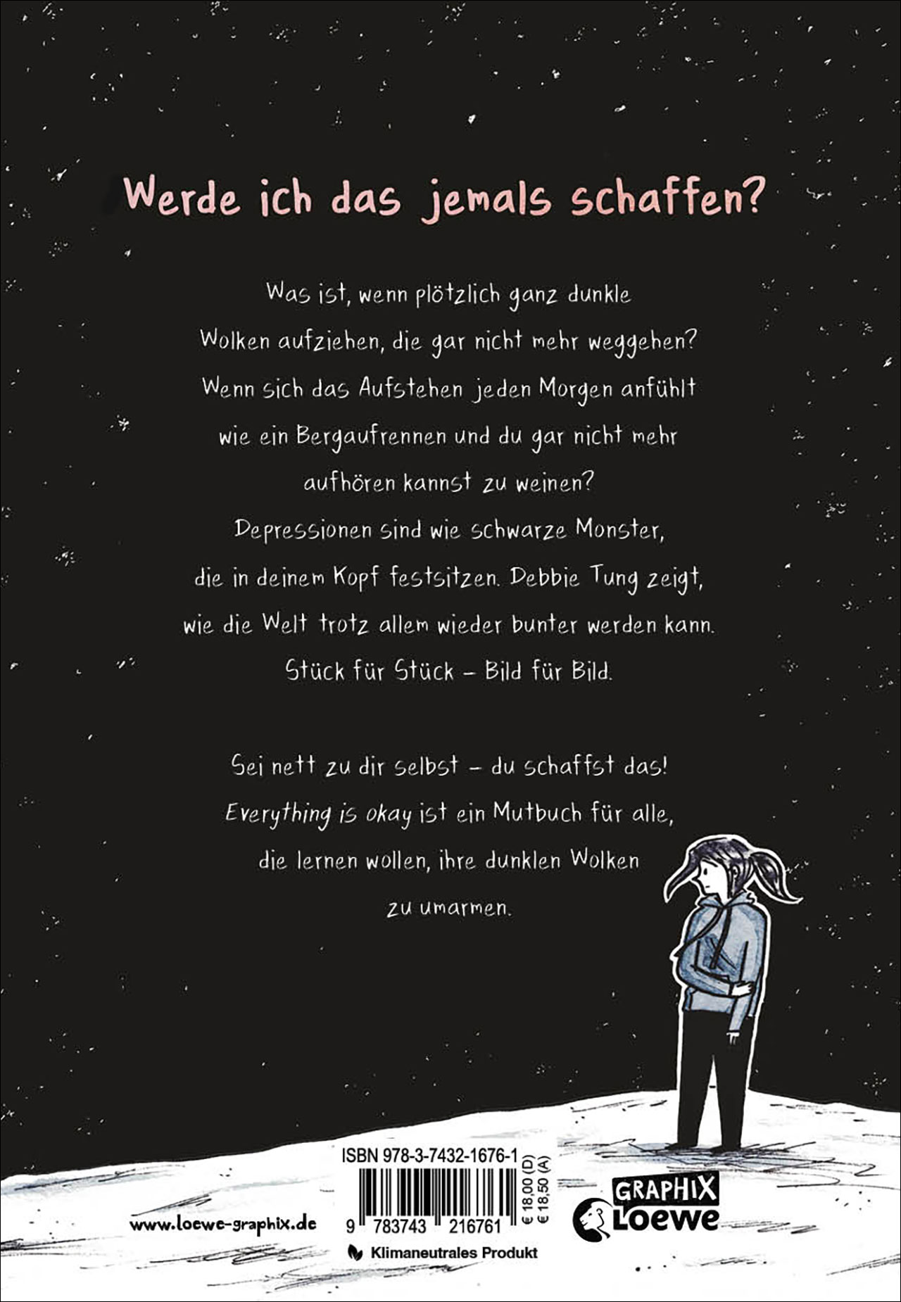 "Ein wichtiges Buch für jedes Alter, das auch Menschen ohne Depressionen lesen sollten, um Anzeichen frühzeitig zu erkennen." BW agrar Landwirtschaftliches Wochenblatt "Ein tolles Buch mit schönen Illustrationen und wichtigen Themen, die mit sehr viel Empathie angesprochen werden. Sehr empfehlenswert." mic book "In diesen Comicstrips kommt so viel mehr Emotionen rüber, als in manchen 500 Seiten Bücher. Ein Buch für Betroffene und für jeden, der mehr über die Krankheit Depressionen". Nadjas.books "Eine bewegende, ehrliche und tiefgründige Graphic Novel über das Thema Depressionen und Ängste. Ein Buch, das Mut macht und hoffentlich in vielen Händen landen wird." Weinlachgummi "Ich finde es super, dass es bei @loewe.verlag Comics wie Debbie Tungs "Everything is okay" gibt, die offen über Mental Health sprechen. Der Comic macht Mut, hilft ein bisschen besser zu verstehen und vor allem: man fühlt sich mit den Problemen nicht so allein." liberarium