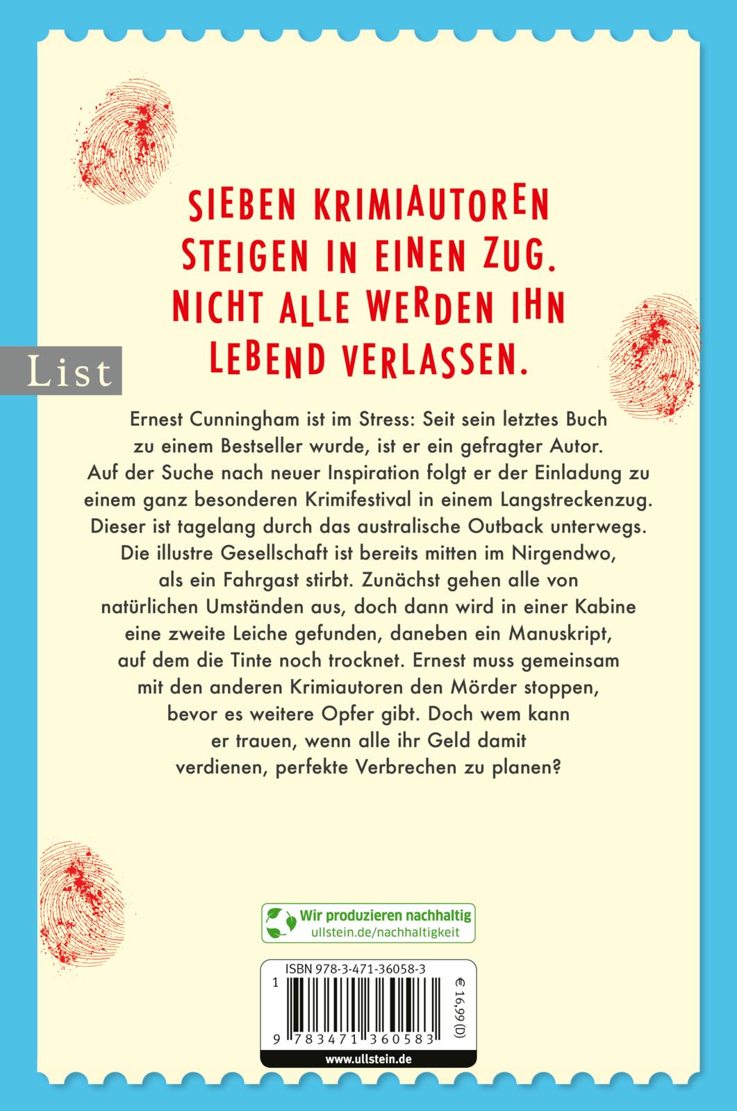 Ernest Cunningham ist im Stress: Seit sein letztes Buch zu einem Bestseller wurde, ist er ein gefragter Autor. Auf der Suche nach neuer Inspiration folgt er der Einladung zu einem ganz besonderen Krimifestival in einem Langstreckenzug. Dieser ist tagelang durch das australische Outback unterwegs. Die illustre Gesellschaft ist bereits mitten im Nirgendwo, als ein Fahrgast stirbt. Zunächst gehen alle von natürlichen Umständen aus, doch dann wird in einer Kabine eine zweite Leiche gefunden, daneben ein Manuskript, auf dem die Tinte noch trocknet. Ernest muss gemeinsam mit den anderen Krimiautoren den Mörder stoppen, bevor es weitere Opfer gibt. Doch wem kann er trauen, wenn alle ihr Geld damit verdienen, perfekte Verbrechen zu planen?