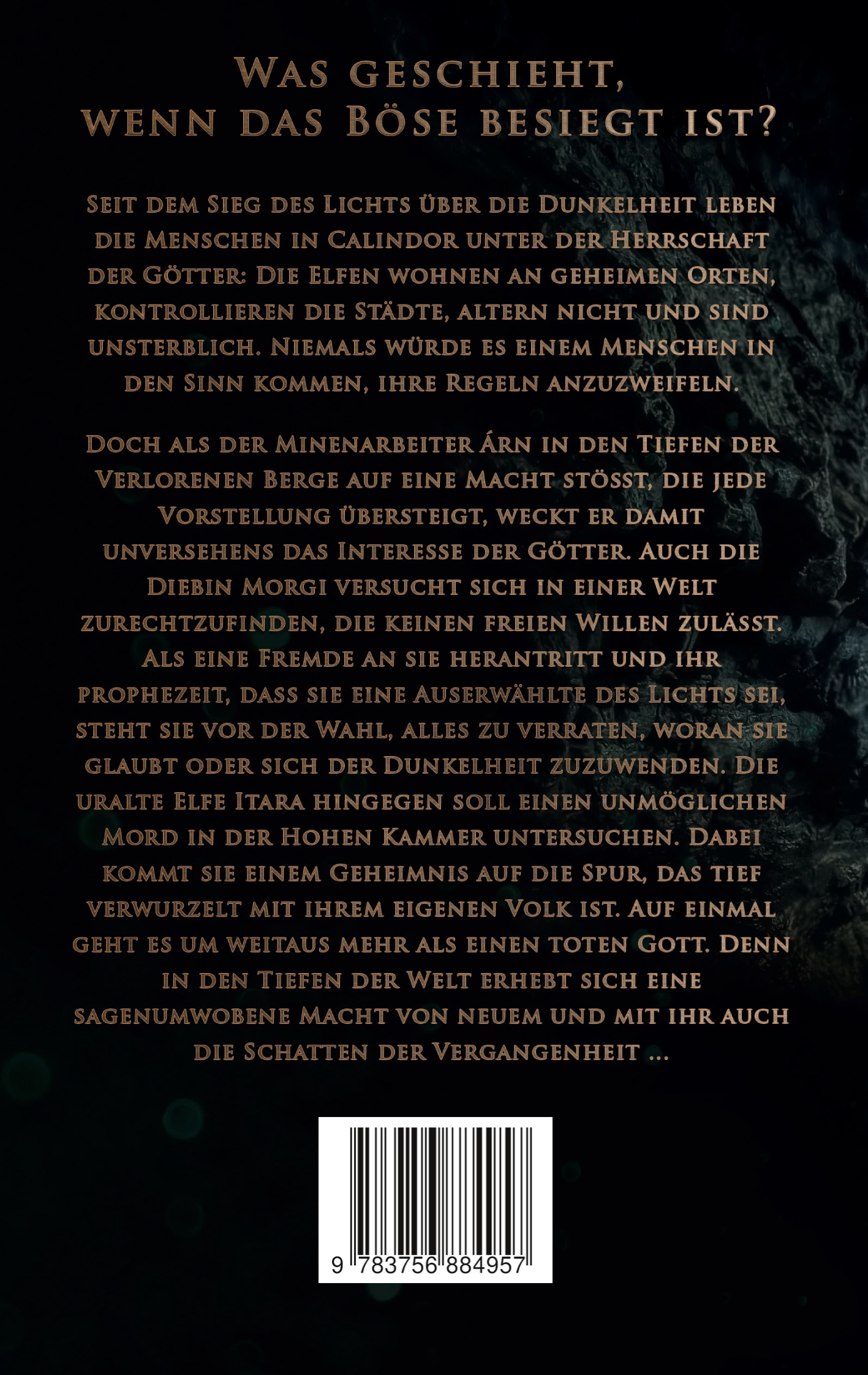 Was geschieht, wenn das Böse besiegt ist?Seit dem Sieg des Lichts über die Dunkelheit leben die Menschen in Calindor unter der Herrschaft der Götter: Die Elfen wohnen an geheimen Orten, kontrollieren die Städte, altern nicht und sind unsterblich. Niemals würde es einem Menschen in den Sinn kommen, ihre Regeln anzuzweifeln.Doch als der Minenarbeiter Árn in den Tiefen der Verlorenen Berge auf eine Macht stößt, die jede Vorstellung übersteigt, weckt er damit unversehens das Interesse der Götter. Auch die Diebin Morgi versucht sich in einer Welt zurechtzufinden, die keinen freien Willen zulässt. Als eine Fremde an sie herantritt und ihr prophezeit, dass sie eine Auserwählte des Lichts sei, steht sie vor der Wahl, alles zu verraten, woran sie glaubt oder sich der Dunkelheit zuzuwenden. Die uralte Elfe Itara hingegen soll einen unmöglichen Mord in der Hohen Kammer untersuchen. Dabei kommt sie einem Geheimnis auf die Spur, das tief verwurzelt mit ihrem eigenen Volk ist. Auf einmal geht es um weitaus mehr als einen toten Gott. Denn in den Tiefen der Welt erhebt sich eine sagenumwobene Macht von neuem und mit ihr auch die Schatten der Vergangenheit ...