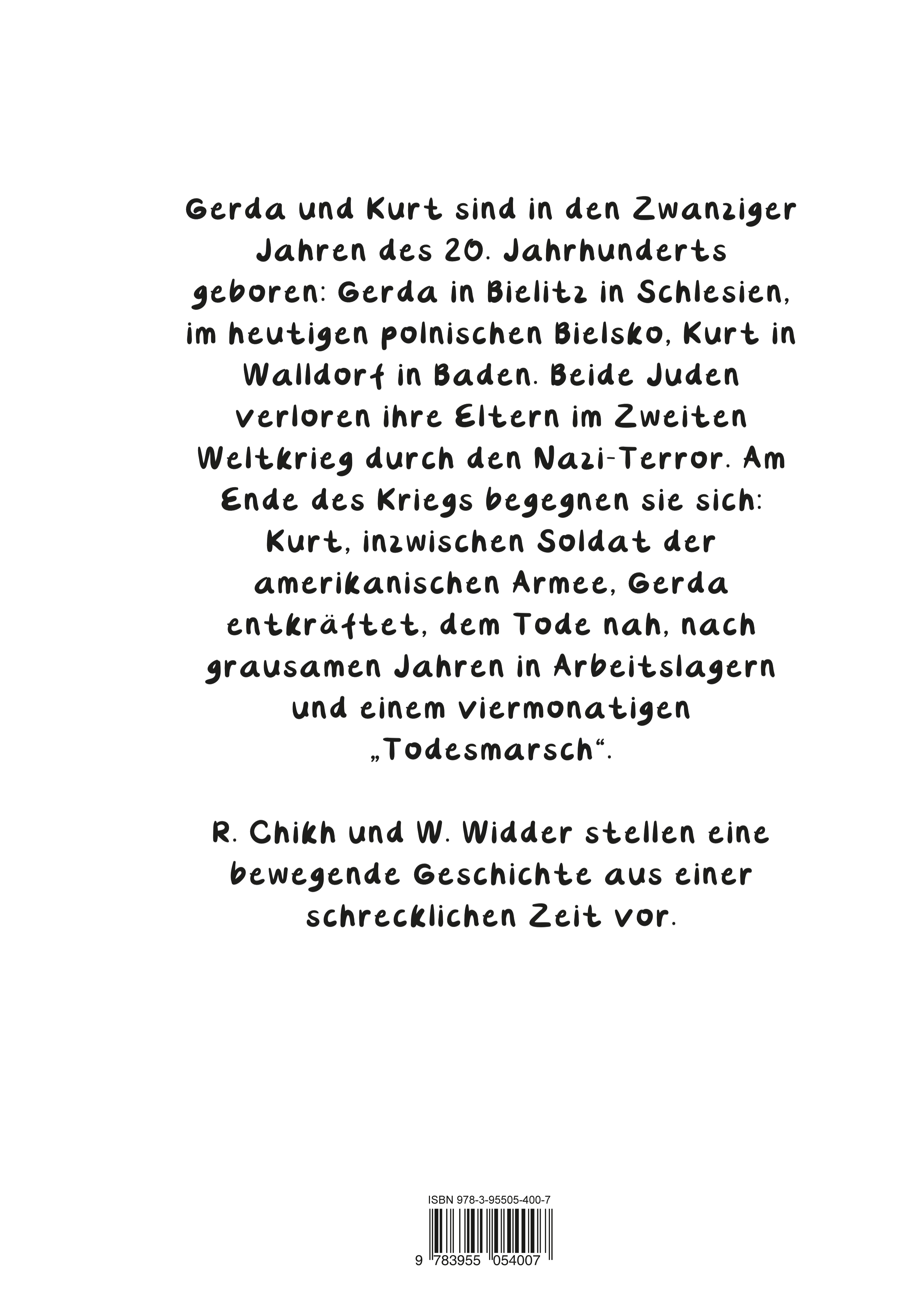 Gerda und Kurt sind in den Zwanziger Jahren des 20. Jahrhunderts geboren: Gerda in Bielitz in Schlesien, Kurt in Walldorf in Baden. Beide Juden verloren ihre Eltern im Zweiten Weltkrieg durch den Naziterror. Am Ende es Krieges begegnen sie sich: Kurt, inzwischen Soldat der amerikanischen Armee, Gerda, entkräftet, dem Tode nahe, nach grausamen Jahren in Arbeitslagern und einem viermonatigen "Todesmarsch". R. Chikh und W. Widder stellen mit dieser Graphic Novel eine bewegende Geschichte aus einer schrecklichen Zeit vor.