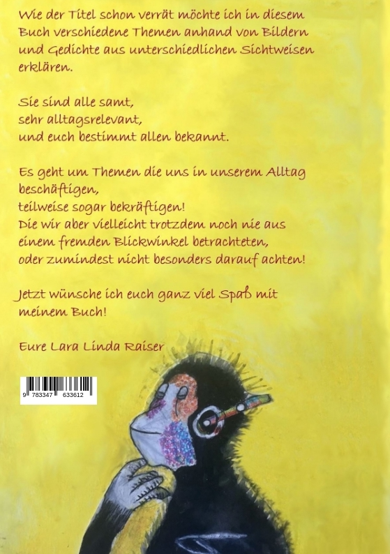 Wie der Titel schon verrät, möchte ich in diesem Buch verschiedene Themen anhand von Bildern und Gedichte aus unterschiedlichen Sichtweisen erklären.Sie sind alle samt, sehr alltagsrelevant,und euch bestimmt allen bekannt.Es geht um Themen, die uns in unserem Alltag beschäftigen, teilweise sogar bekräftigen!Die wir aber vielleicht trotzdem noch wie aus einem fremden Blickwinkel betrachteten, oder zumindest nicht besonders darauf achten!Jetzt wünsche ich euch ganz viel Spaß mit meinem Buch!Eure Lara Linda Raiser