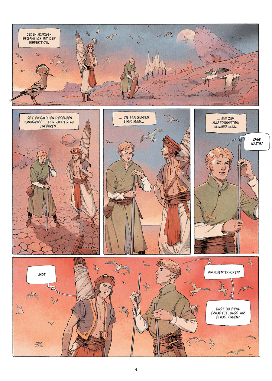 Die Einwohner des Fischerdorfes Goëm sind der Verzweiflung nahe: Zuerst verschwindet der zweite Mond spurlos vom Himmel, und kurz darauf tut das Meer selbst es ihm gleich. Die Bucht von Sprague verwandelt sich zusehends in eine Wüste. Mit dem Wasser verlieren die Menschen auch ihre Lebensgrundlage, und darum entsendet Goëm zwei Expeditionen ins Ungewisse, um die Ursache der Dürre zu finden. Beide kehren nie zurück. Als die Not überwältigend wird, beschließen die Brüder Vivian und Niels, sich ebenfalls auf die Suche zu machen - auf eigene Faust und ohne den Segen des Dorfrates...SF-Routinier Rodolphe (»TER«, »Amazonia«) bleibt seinem Erfolgsrezept treu: »Sprague« ist ein im besten Sinne klassischer Science-Fiction-Oneshot, der von Zeichner Roman Olivier und vor allem dem Koloristen Denis Béchu in traumhafte Bilder gefasst wird.