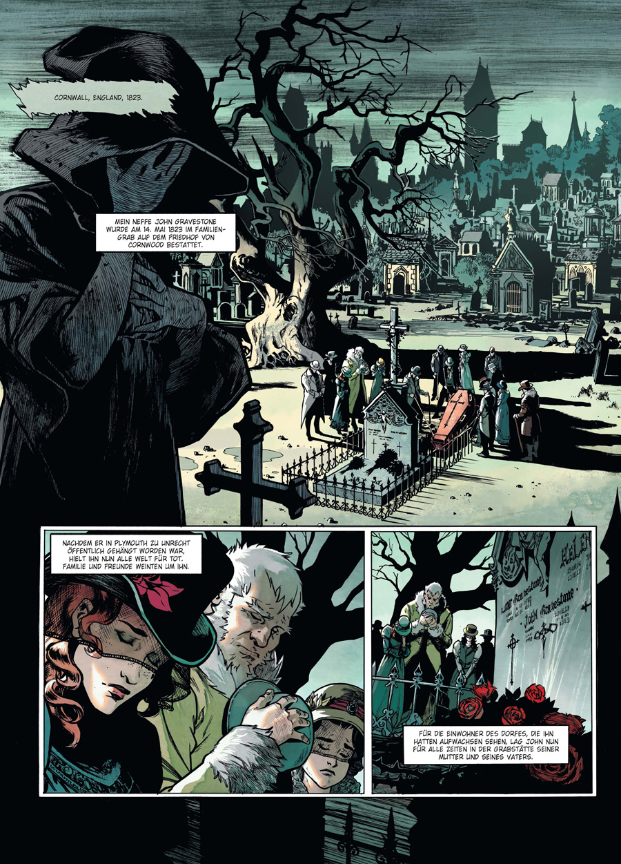 Nachdem er von Camilla, der Striga, die einst seinen Vater tötete, gebissen wurde, steht John Gravestone das Schicksal anheim, selbst zu einer Kreatur der Finsternis zu werden. In einem verzweifelten Rettungsversuch bringen Johns Onkel Theophilus sowie der treue Diener Tibbett ihn nach Schottland, das Land seiner Ahnen. Doch bleibt Camilla ihnen dicht auf den Fersen, um ihr Werk zu vollenden. Das Schicksal der Gravestones wird sich dadurch entscheiden, welche Richtung die unheilvolle Romanze der Erbfeinde einschlagen wird...Angesiedelt knapp 100 Jahre vor »Dracula«, sind in Jérqome Le Gris und Nicolas Siners gotisch-düsteren Vampir-Mythos »Lord Gravestone« viktorianische Ästhetik und effektvolle Comic-Kunst zu einem faszinierenden Ganzen vereint. Dabei zitieren die Künstler lustvoll sowohl aus literarischen Vorlagen, die schon Bram Stoker inspirierten, als auch aus moderner Phantastik wie »The Witcher«.