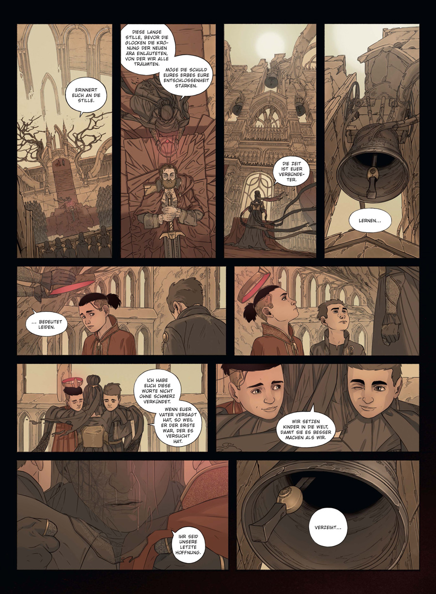 Es war das Ungeziefer, das uns vernichtete. Es drang ein in unsere Häuser und unsere Ernten, in unser Fleisch und in unser Blut, in unser Wasser, unseren Boden und in die Luft, die wir atmeten. Der ökologische Kollaps der Erde war gekommen.In ForenHaye, der letzten Bastion der Menschheit im Königreich Talion, stemmt man sich mit aller Kraft gegen die Auslöschung. Doch die Gesellschaft zersetzt sich gleichzeitig von innen: Hoch oben in den Wipfeln der Zitadelle genießen die Adligen sauberes Wasser und reine Luft, während die Ärmsten in den Wurzelbezirken verzweifelt um jeden Schluck und jeden Atemzug ringen. Als eine wohltätige Tochter aus gutem Hause durch Zufall auf einen seltsamen Streuner trifft, der in den Ruinen der alten Stadt nach einem Heilmittel sucht, wird ein Funke der Hoffnung entfacht. Vielleicht können die siechende Menschheit und die sterbende Natur doch noch zueinander finden.Sylvain Ferret verschreibt sich mit »Talion« einer Ästhetik, die er als »Gothic Cyberpunk« bezeichnet. Er öffnet für uns die Türen zu einer faszinierenden Welt, die wie ein dunkler Spiegel unserer eigenen wirkt. Verschwenderische Zeichenkunst sowie komplexe Charaktere und Themen machen diese Comic-Trilogie zu einem schwindelerregenden, süchtig machenden Erlebnis.