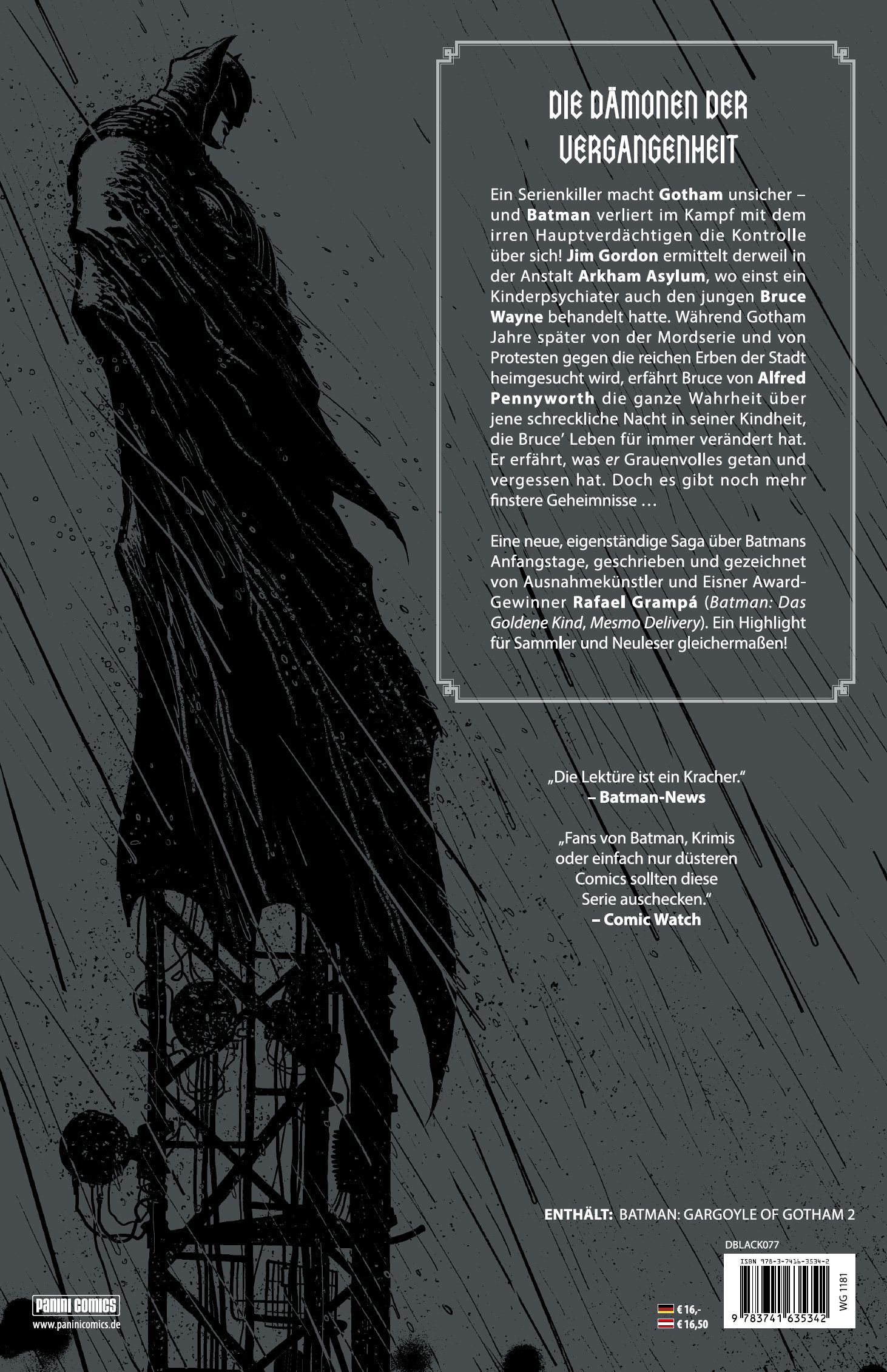DIE DÄMONEN DER VERGANGENHEITEin Serienkiller macht Gotham unsicher - und Batman verliert im Kampf mit dem irren Hauptverdächtigen die Kontrolle über sich! Jim Gordon ermittelt derweil in der Anstalt Arkham Asylum, wo einst ein Kinderpsychiater auch den jungen Bruce Wayne behandelt hatte. Während Gotham Jahre später von der Mordserie und von Protesten gegen die reichen Erben der Stadt heimgesucht wird, erfährt Bruce von Alfred Pennyworth die ganze Wahrheit über jene schreckliche Nacht in seiner Kindheit, die Bruce' Leben für immer verändert hat. Er erfährt, was er Grauenvolles getan und vergessen hat. Doch es gibt noch mehr finstere Geheimnisse ... Eine neue, eigenständige Saga über Batmans Anfangstage, geschrieben und gezeichnet von Ausnahmekünstler und Eisner Award-Gewinner Rafael Grampá (Batman: Das Goldene Kind, Mesmo Delivery). Ein Highlight für Sammler und Neuleser gleichermaßen!ENTHÄLT: BATMAN: GARGOYLE OF GOTHAM 2