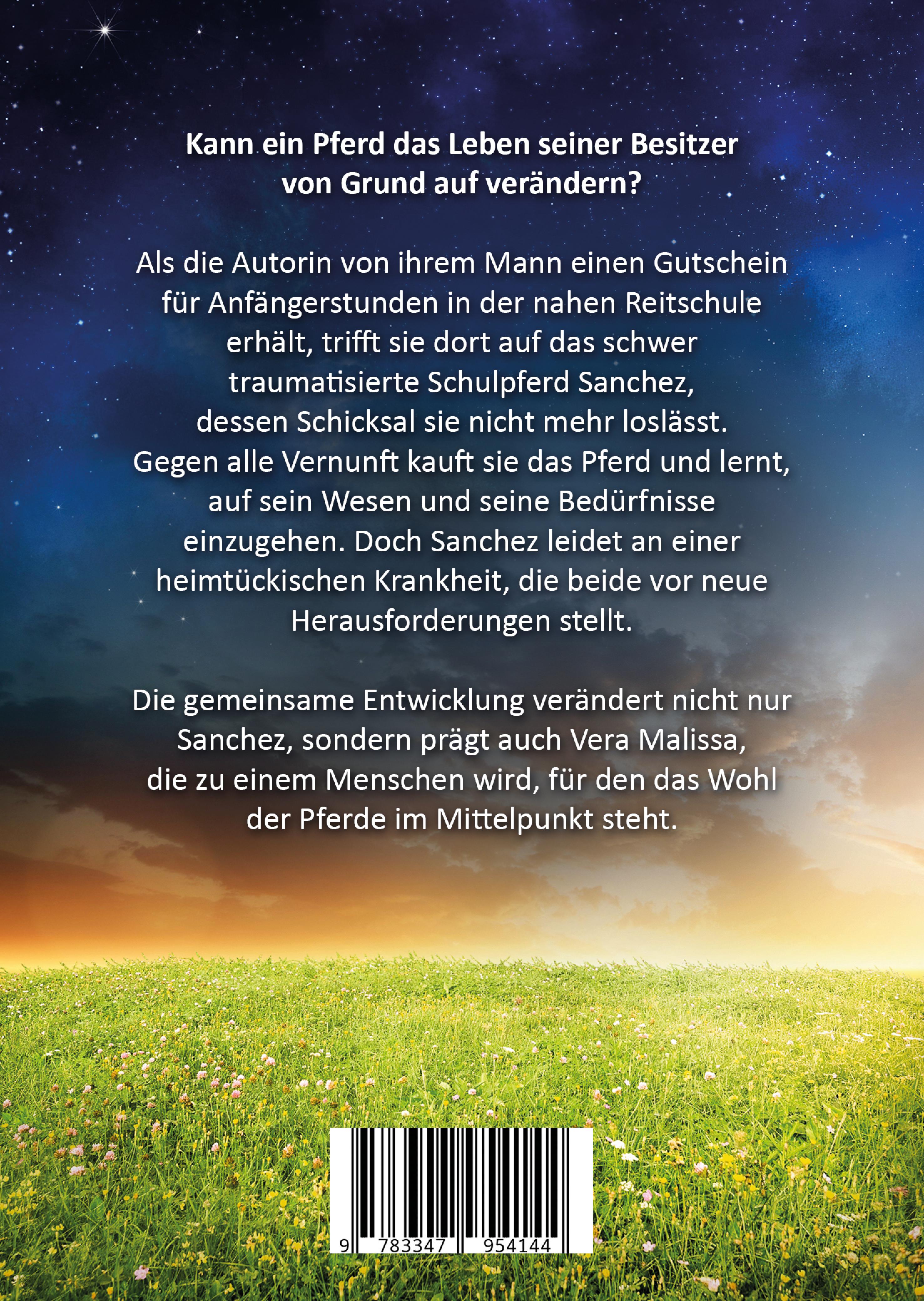 Kann ein Pferd das Leben seiner Besitzer von Grund auf verändern?Als die Autorin von ihrem Mann einen Gutschein für Anfängerstunden in der nahen Reitschule erhält, trifft sie dort auf das schwer traumatisierte Schulpferd Sanchez, dessen Schicksal sie nicht mehr loslässt. Gegen alle Vernunft kauft sie das Pferd und lernt, auf sein Wesen und seine Bedürfnisse einzugehen. Doch Sanchez leidet an einer heimtückischen Krankheit, die beide vor neue Herausforderungen stellt.Die gemeinsame Entwicklung verändert nicht nur Sanchez, sondern prägt auch Vera Malissa, die zu einem Menschen wird, für den das Wohl der Pferde im Mittelpunkt steht.Ein Buch über Zweifel, Angst und Liebe, wie es nur das Leben schreiben kann. Mit 12 farbigen Abbildungen.