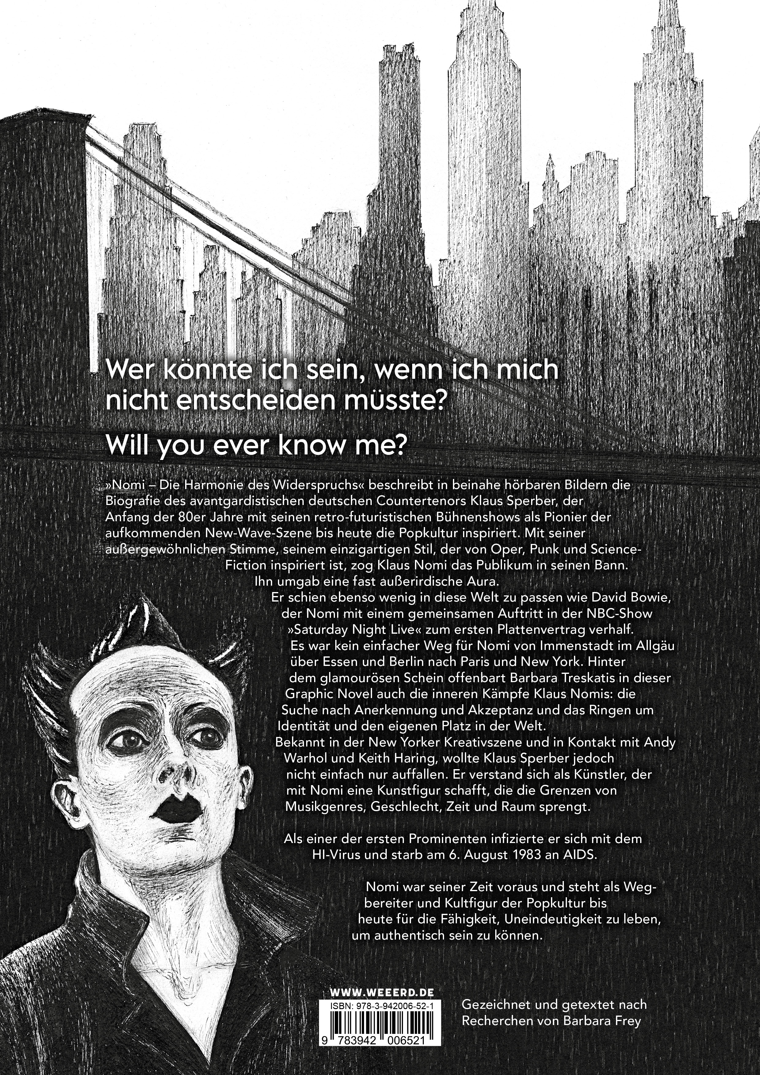 Wer könnte ich sein, wenn ich mich nicht entscheiden müsste? Will you ever know me?»Nomi - Die Harmonie des Widerspruchs« beschreibt in beinahe hörbaren Bildern die Biografie des avantgardistischen deutschen Countertenors Klaus Sperber, der Anfang der 80er Jahre mit seinen retro-futuristischen Bühnenshows als Pionier der aufkommenden New-Wave-Szene bis heute die Popkultur inspiriert. Mit seiner außergewöhnlichen Stimme, seinem einzigartigen Stil, der von Oper, Punk und Science-Fiction inspiriert ist, zog Klaus Nomi das Publikum in seinen Bann. Ihn umgab eine fast außerirdische Aura. Er schien ebenso wenig in diese Welt zu passen wie David Bowie, der Nomi mit einem gemeinsamen Auftritt in der NBC-Show »Saturday Night Live« zum ersten Plattenvertrag verhalf. Es war kein einfacher Weg für Nomi von Immenstadt im Allgäu über Essen und Berlin nach Paris und New York. Hinter dem glamourösen Schein offenbart Barbara Treskatis in dieser Graphic Novel auch die inneren Kämpfe Klaus Nomis: die Suche nach Anerkennung und Akzeptanz und das Ringen um Identität und den eigenen Platz in der Welt. Bekannt in der New Yorker Kreativszene und in Kontakt mit Andy Warhol und Keith Haring, wollte Klaus Sperber jedoch nicht einfach nur auffallen. Er verstand sich als Künstler, der mit Nomi eine Kunstfigur schafft, die die Grenzen von Musikgenres, Geschlecht, Zeit und Raum sprengt.Als einer der ersten Prominenten infizierte er sich mit dem HI-Virus und starb am 6. August 1983 an AIDS.Nomi war seiner Zeit voraus und steht als Wegbereiter und Kultfigur der Popkultur bis heute für die Fähigkeit, Uneindeutigkeit zu leben, um authentisch sein zu können.Gezeichnet und getextet nach Recherchen von Barbara Frey