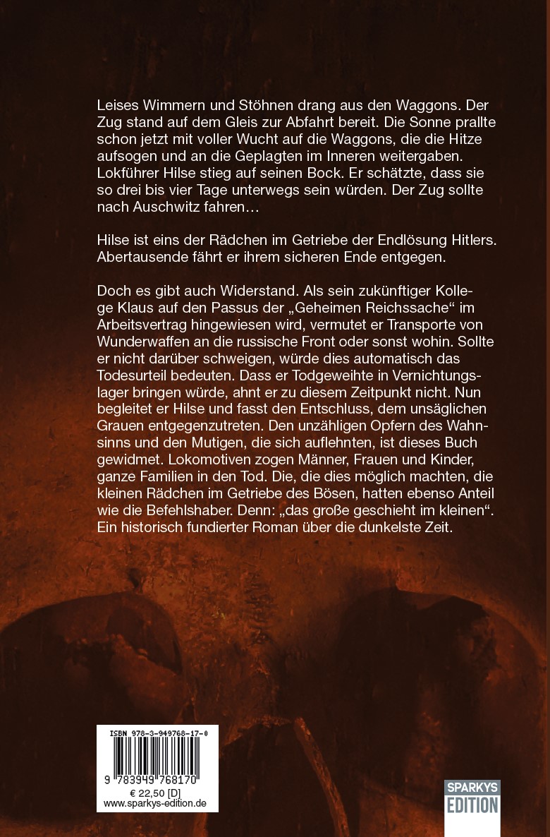| Schlagworte | Ausschwitz • Deutsche Geschichte • Deutsche Reichsbahn • Historischer Roman • Holocaust • Jüdischer Glaube • leben im nationalsozialismus • Liebe • Macht • Nationalsozialismus • Zweiter Weltkrieg |