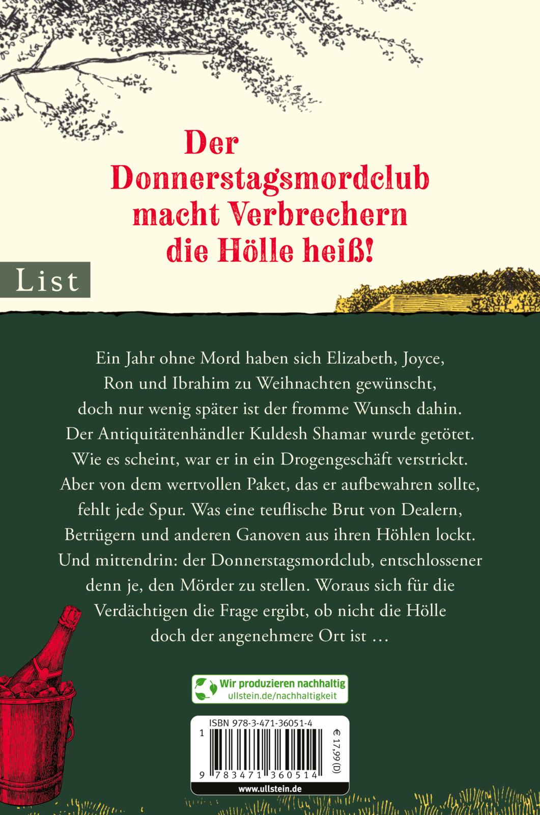 Ein Jahr ohne Mord haben sich Elizabeth, Joyce, Ron und Ibrahim zu Weihnachten gewünscht, doch nur wenig später ist der fromme Wunsch dahin. Der Antiquitätenhändler Kuldesh Shamar wurde getötet. Wie es scheint, war er in ein Drogengeschäft verstrickt. Aber von dem wertvollen Paket, das er aufbewahren sollte, fehlt jede Spur. Was eine teuflische Brut von Dealern, Betrügern und anderen Ganoven aus ihren Höhlen lockt. Und mittendrin: der Donnerstagsmordclub, entschlossener denn je, den Mörder zu stellen. Woraus sich für die Verdächtigen die Frage ergibt, ob nicht die Hölle doch der angenehmere Ort ist ...