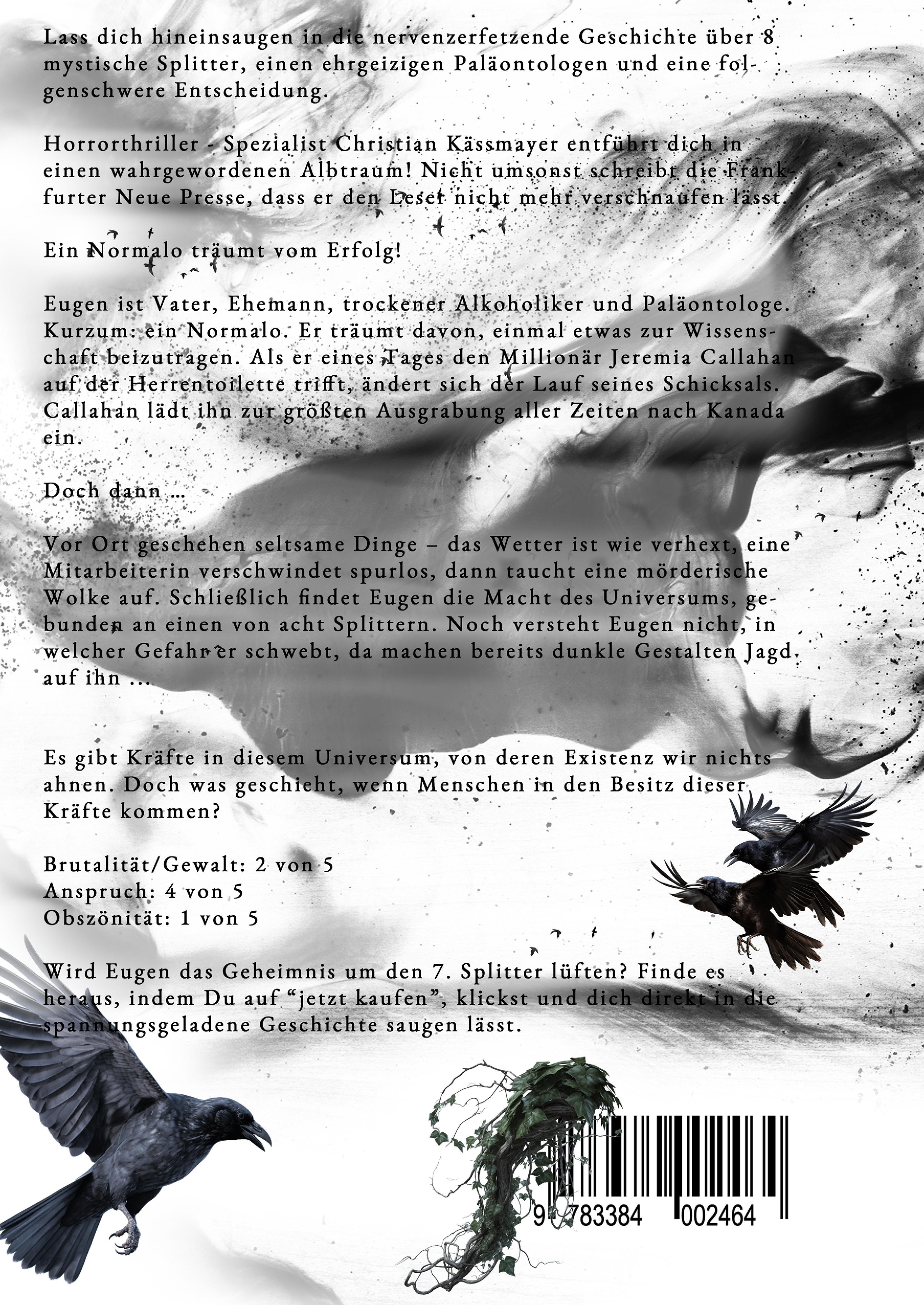 Lass dich hineinsaugen in die nervenzerfetzende Geschichte über 8 mystische Splitter, einen ehrgeizigen Paläontologen und eine folgenschwere Entscheidung.Horrorthriller - Spezialist Christian Kässmayer entführt dich in einen wahrgewordenen Albtraum! Nicht umsonst schreibt die Frankfurter Neue Presse, dass er den Leser nicht mehr verschnaufen lässt.Ein Normalo träumt vom Erfolg!Eugen ist Vater, Ehemann, trockener Alkoholiker und Paläontologe. Kurzum: ein Normalo. Er träumt davon, einmal etwas zur Wissenschaft beizutragen. Als er eines Tages den Millionär Jeremia Callahan auf der Herrentoilette trifft, ändert sich der Lauf seines Schicksals. Callahan lädt ihn zur größten Ausgrabung aller Zeiten nach Kanada ein.Doch dann ...Vor Ort geschehen seltsame Dinge - das Wetter ist wie verhext, eine Mitarbeiterin verschwindet spurlos, dann taucht eine mörderische Wolke auf. Schließlich findet Eugen die Macht des Universums, gebunden an einen von acht Splittern. Noch versteht Eugen nicht, in welcher Gefahr er schwebt, da machen bereits dunkle Gestalten Jagd auf ihn ...Es gibt Kräfte in diesem Universum, von deren Existenz wir nichts ahnen. Doch was geschieht, wenn Menschen in den Besitz dieser Kräfte kommen?Brutalität/Gewalt: 2 von 5Anspruch: 4 von 5Obszönität: 1 von 5Wird Eugen das Geheimnis um den 7. Splitter lüften? Finde es heraus, indem Du auf "jetzt kaufen", klickst und dich direkt in die spannungsgeladene Geschichte saugen lässt.