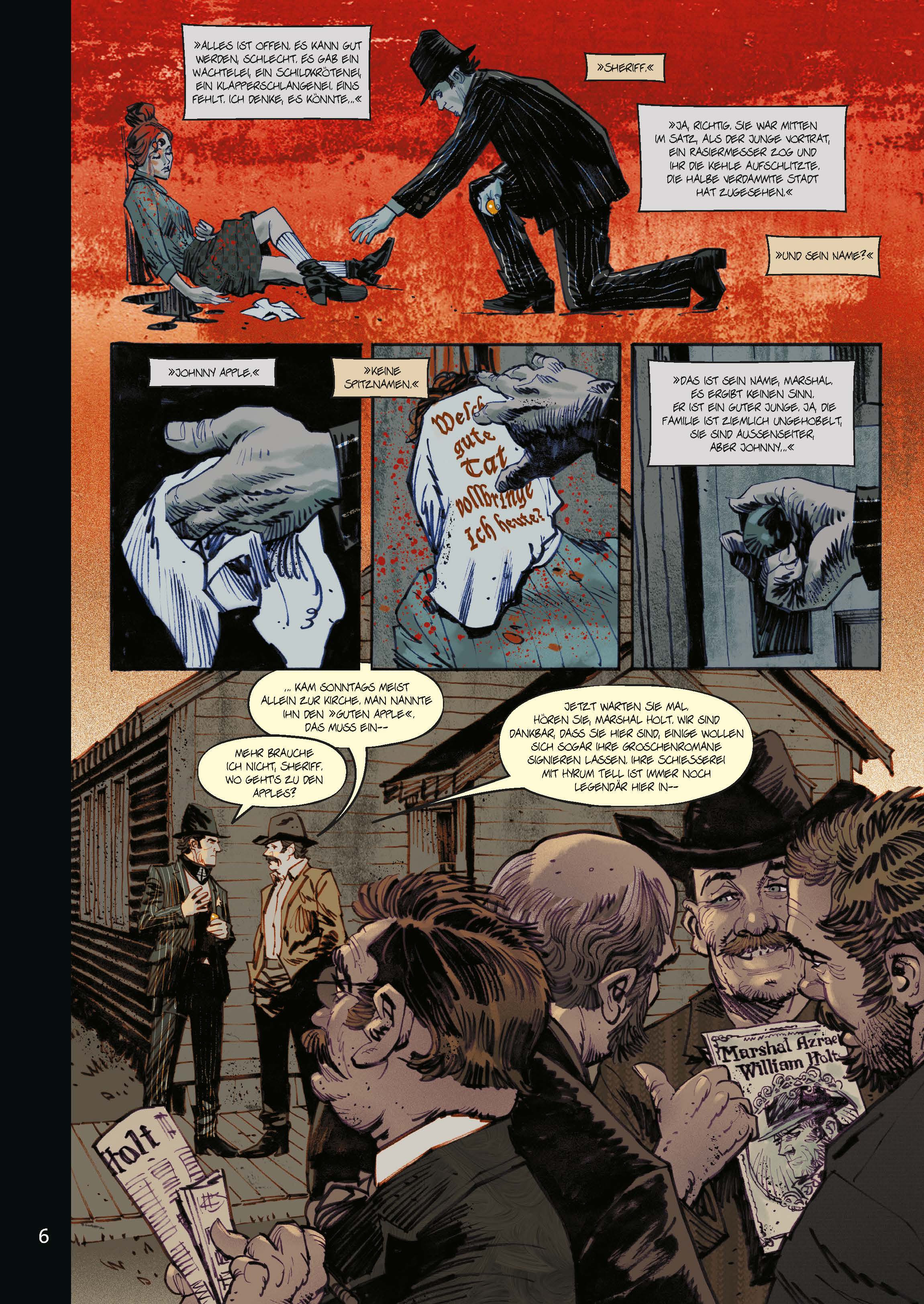 Marshal Holt ist mehr als ein wandernder Gesetzeshüter und ein begnadeter Schütze, er ist eine lebende Legende. Dank der Groschenromane über seine Abenteuer ist Holt im ganzen Westen bekannt - seine Fans vergöttern ihn, und Schurken nehmen beim Anblick seiner markigen Gesichtsmaske Reißaus. Eine unerklärliche Serie brutaler Morde führen Holt an den Schauplatz einer seiner größten Heldentaten: in das verschlafene Nest Canary und dessen aufgegebene Kupfermine. Was Holt dort zutage fördert, ist grauenhafter als alles, was er sich vorstellen kann...Dieser Western bringt das Blut in den Adern zum Gefrieren! »Canary« ist ein Horror-Thriller im Western-Gewand, der die routinierten Illustrationen von Marvel- und Image-Veteran Dan Panosian und Scott Snyders packendes Storytelling kongenial zusammenführt.