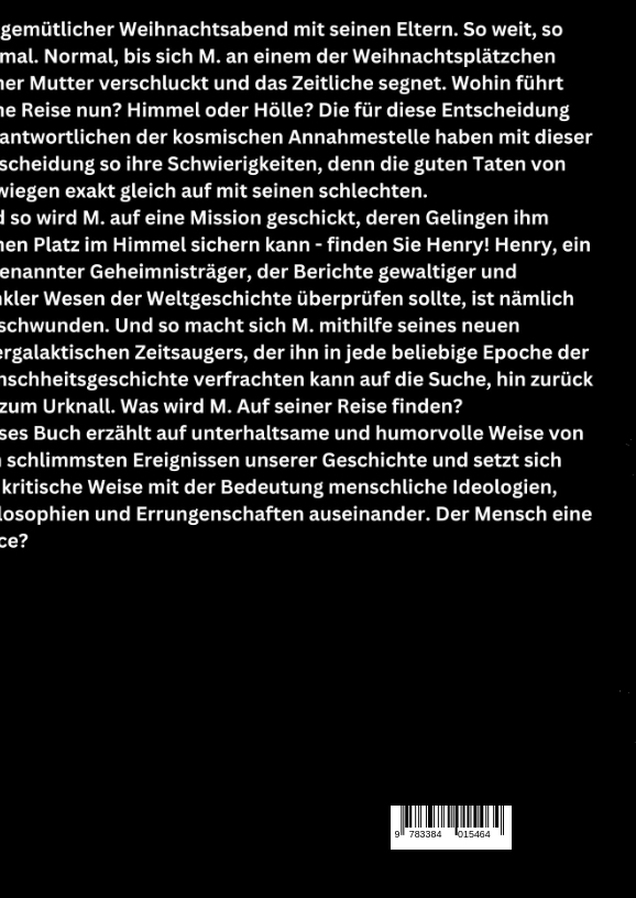 Ein gemütlicher Weihnachtsabend mit seinen Eltern. So weit, so normal. Normal, bis sich M. an einem der Weihnachtsplätzchen seiner Mutter verschluckt und das Zeitliche segnet. Wohin führt seine Reise nun? Himmel oder Hölle? Die für diese Entscheidung Verantwortlichen der kosmischen Annahmestelle haben mit dieser Entscheidung so ihre Schwierigkeiten, denn die guten Taten von M. wiegen exakt gleich auf mit seinen schlechten.Und so wird M. auf eine Mission geschickt, deren Gelingen ihm seinen Platz im Himmel sichern kann - finden Sie Henry! Henry, ein sogenannter Geheimnisträger, der Berichte gewaltiger und dunkler Wesen der Weltgeschichte überprüfen sollte, ist nämlich verschwunden. Und so macht sich M. mithilfe seines neuen intergalaktischen Zeitsaugers, der ihn in jede beliebige Epoche der Menschheitsgeschichte verfrachten kann auf die Suche, hin zurück bis zum Urknall. Was wird M. Auf seiner Reise finden?Dieses Buch erzählt auf unterhaltsame und humorvolle Weise von den schlimmsten Ereignissen unserer Geschichte und setzt sich auf kritische Weise mit der Bedeutung menschliche Ideologien, Philosophien und Errungenschaften auseinander. Der Mensch eine Farce?
