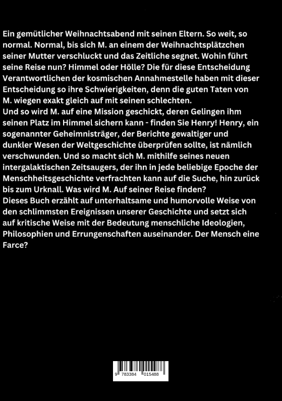 Ein gemütlicher Weihnachtsabend mit seinen Eltern. So weit, so normal. Normal, bis sich M. an einem der Weihnachtsplätzchen seiner Mutter verschluckt und das Zeitliche segnet. Wohin führt seine Reise nun? Himmel oder Hölle? Die für diese Entscheidung Verantwortlichen der kosmischen Annahmestelle haben mit dieser Entscheidung so ihre Schwierigkeiten, denn die guten Taten von M. wiegen exakt gleich auf mit seinen schlechten.Und so wird M. auf eine Mission geschickt, deren Gelingen ihm seinen Platz im Himmel sichern kann - finden Sie Henry! Henry, ein sogenannter Geheimnisträger, der Berichte gewaltiger und dunkler Wesen der Weltgeschichte überprüfen sollte, ist nämlich verschwunden. Und so macht sich M. mithilfe seines neuen intergalaktischen Zeitsaugers, der ihn in jede beliebige Epoche der Menschheitsgeschichte verfrachten kann auf die Suche, hin zurück bis zum Urknall. Was wird M. Auf seiner Reise finden?Dieses Buch erzählt auf unterhaltsame und humorvolle Weise von den schlimmsten Ereignissen unserer Geschichte und setzt sich auf kritische Weise mit der Bedeutung menschliche Ideologien, Philosophien und Errungenschaften auseinander. Der Mensch eine Farce?
