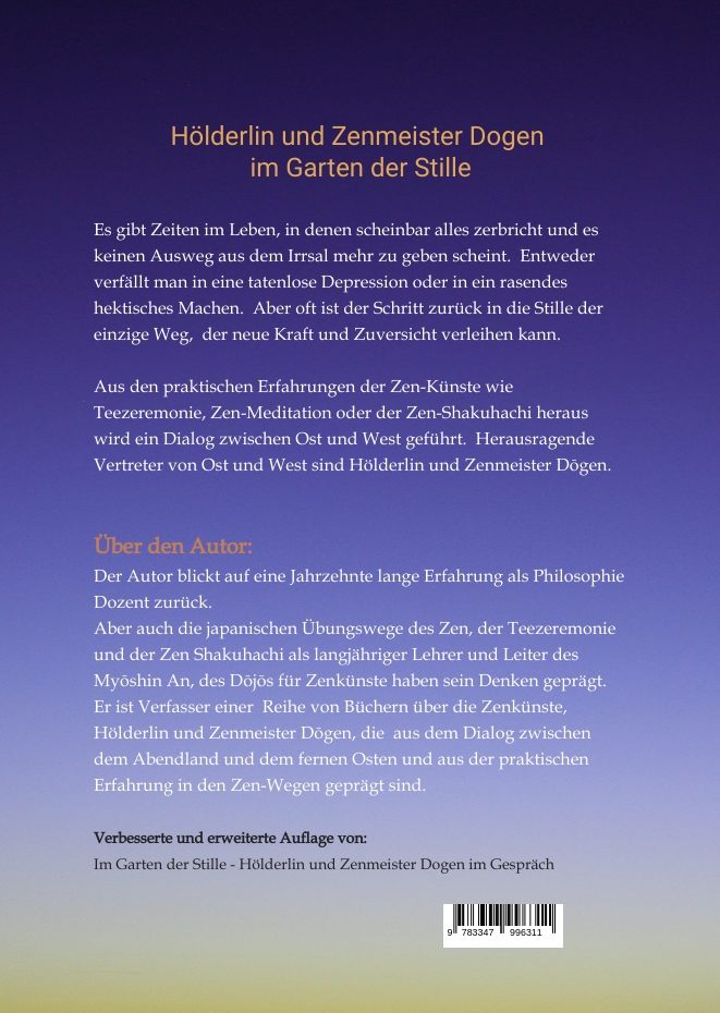 Es gibt Zeiten im Leben, in denen scheinbar alles zerbricht und es keinen Ausweg aus dem Irrsal mehr zu geben scheint. Entweder verfällt man in eine tatenlose Depression oder in ein rasendes hektisches Machen. Aber oft ist der Schritt zurück in die Stille der einzige Weg, der neue Kraft und Zuversicht verleihen kann.Aus den praktischen Erfahrungen der Zen-Künste wie Teezeremonie, Zen-Meditation oder der Zen-Shakuhachi heraus wird ein Dialog zwischen Ost und West geführt. Im Zentrum der Untersuchung steht die Vergänglichkeit aller Dinge aus der Sicht des Abendlandes und des Buddhismus, insbesondere Japan.Herausragende Vertreter von Ost und West sind Hölderlin und Zenmeister D gen. Die Texte werden allgemeinverständlich interpretiert. Beispiele aus dem Zenweg der Teezeremonie verdeutlichen die Philosophie Japans.