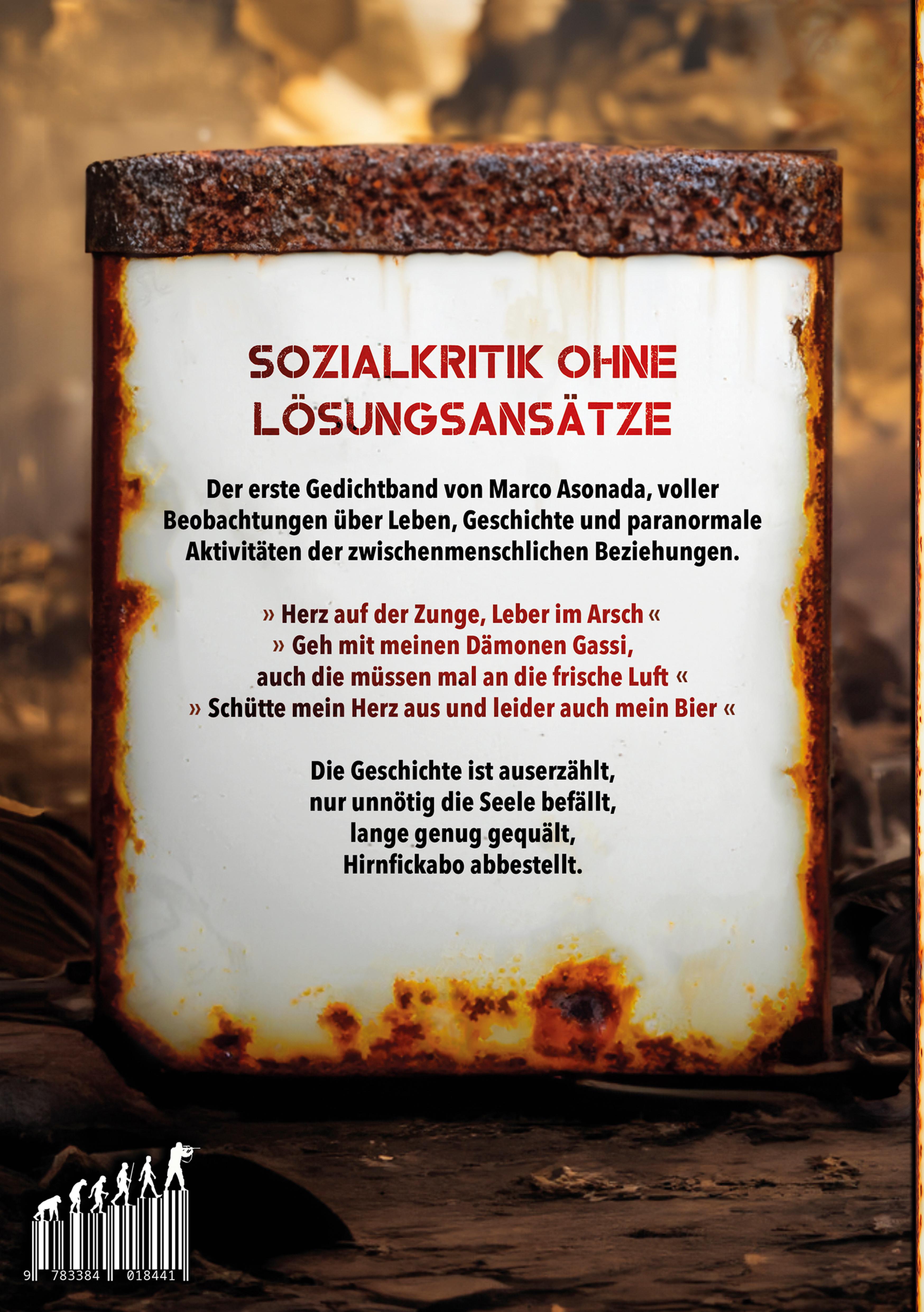 Im ersten Gedichtband von Marco Asonada geht es um die Gesellschaft im allgemeinen und sie wird auch nicht zu gering kritisiert. Selbstverständlich wie der Titel schon aussagt, ohne Lösungsansätze anzubieten.