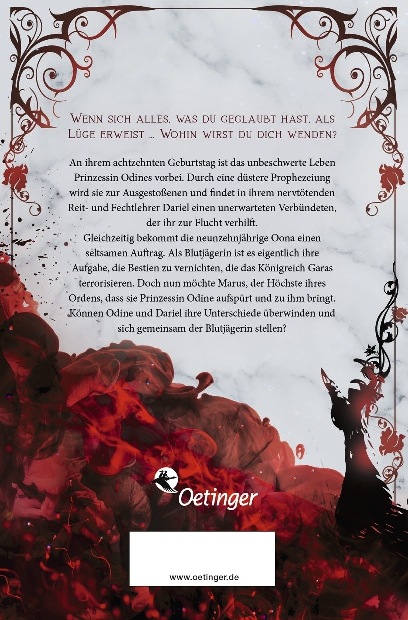 Gleichzeitig bekommt die neunzehnjährige Oona einen seltsamen Auftrag. Als Blutjägerin ist es eigentlich ihre Aufgabe, die Bestien zu vernichten, die das Königreich Garas terrorisieren. Doch nun möchte Marus, der höchste ihres Ordens, dass sie Prinzessin Odine aufspürt und zu ihm bringt.