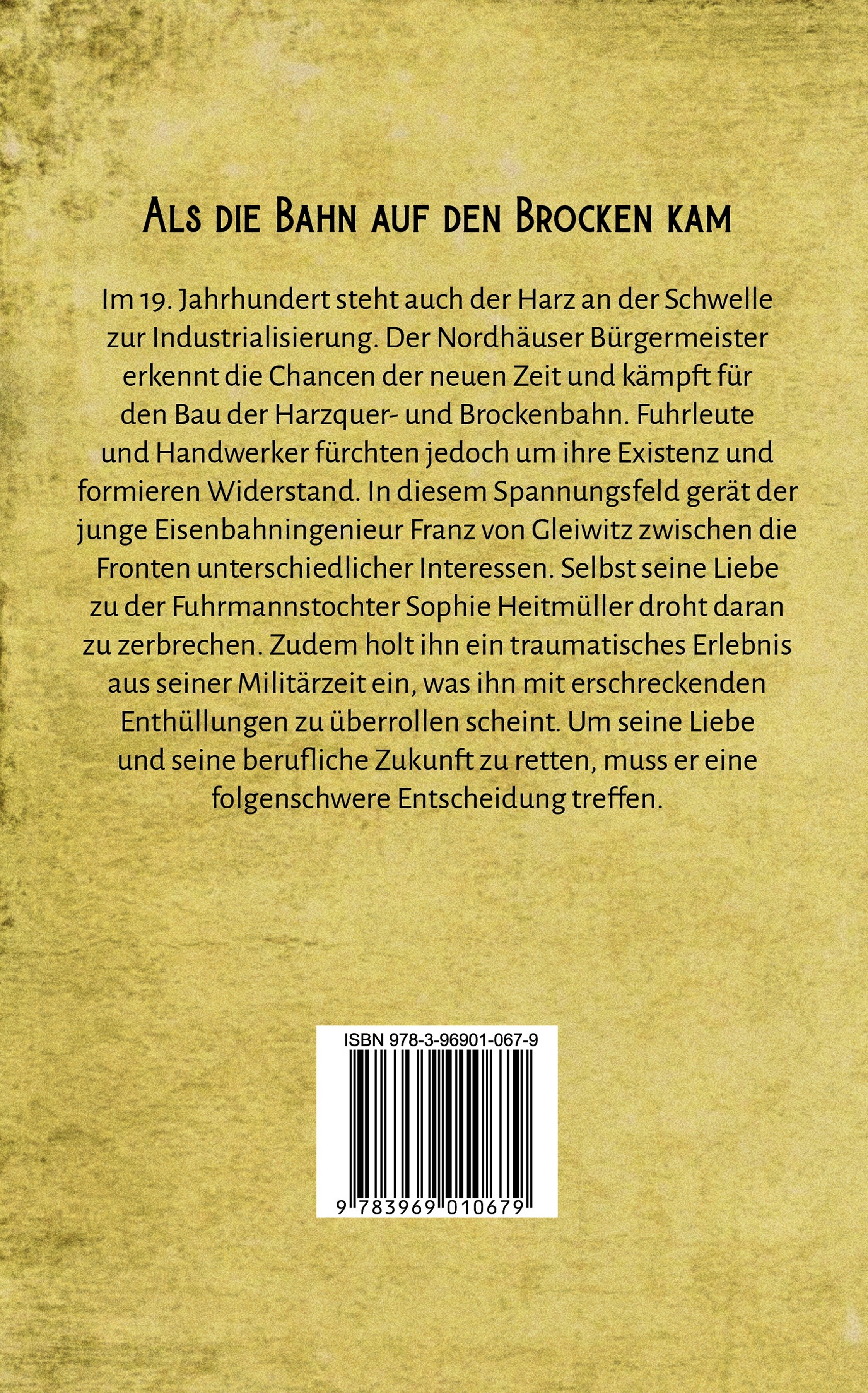 Als die Bahn auf den Brocken kam: Im 19. Jahrhundert steht auch der Harz an der Schwelle zur Industrialisierung. Der Nordhäuser Bürgermeister erkennt die Chancen der neuen Zeit und kämpft für den Bau der Harzquer- und Brockenbahn. Fuhrleute und Handwerker fürchten jedoch um ihre Existenz und formieren Widerstand. In diesem Spannungsfeld gerät der junge Eisenbahningenieur Franz von Gleiwitz zwischen die Fronten unterschiedlicher Interessen. Selbst seine Liebe zu der Fuhrmannstochter Sophie Heitmüller droht daran zu zerbrechen. Zudem holt ihn ein traumatisches Erlebnis aus seiner Militärzeit ein, was ihn mit erschreckenden Enthüllungen zu überrollen scheint. Um seine Liebe und seine berufliche Zukunft zu retten, muss er eine folgenschwere Entscheidung treffen.