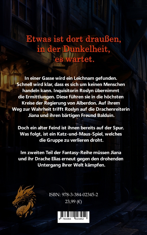 Etwas ist dort draußen, in der Dunkelheit. Es wartet.In einer Gasse wird ein Leichnam gefunden. Schnell wird klar, dass es sich um keinen Menschen handeln kann. Inquisitorin Roslyn übernimmt die Ermittlungen. Diese führen sie in die höchsten Kreise der Regierung von Alberdon. Auf ihrem Weg zur Wahrheit trifft Roslyn auf die Drachenreiterin Jiana und ihren bärtigen Freund Balduin.Doch ein alter Feind ist ihnen bereits auf der Spur. Was folgt, ist ein Katz-und-Maus-Spiel, welches die Gruppe zu verlieren droht.Im zweiten Teil der Fantasy-Reihe müssen Jiana und ihr Drachen Elias erneut gegen den drohenden Untergang ihrer Welt kämpfen.
