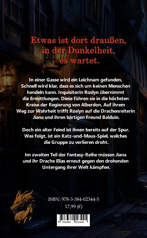 Etwas ist dort draußen, in der Dunkelheit. Es wartet.In einer Gasse wird ein Leichnam gefunden. Schnell wird klar, dass es sich um keinen Menschen handeln kann. Inquisitorin Roslyn übernimmt die Ermittlungen. Diese führen sie in die höchsten Kreise der Regierung von Alberdon. Auf ihrem Weg zur Wahrheit trifft Roslyn auf die Drachenreiterin Jiana und ihren bärtigen Freund Balduin.Doch ein alter Feind ist ihnen bereits auf der Spur. Was folgt, ist ein Katz-und-Maus-Spiel, welches die Gruppe zu verlieren droht.Im zweiten Teil der Fantasy-Reihe müssen Jiana und ihr Drachen Elias erneut gegen den drohenden Untergang ihrer Welt kämpfen.