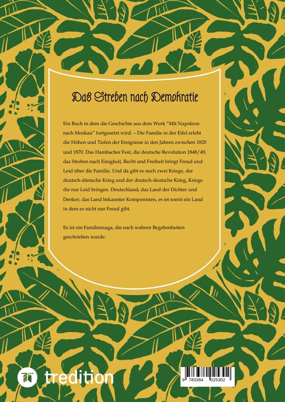 Es ist die Zeit nach den napoleonischen Kriegen, die Zeit von 1820 bis 1870, die Zeit in der es Freud und Leid für eine Familie in der Eifel gibt. Familienmitglieder machen das Hambacher Fest mit, erleben die deutsche Revolution 1848/49 und zwei Kriege, die nur Leid bringen, wie der deutsch-dänische Krieg und der deutsch-deutsche Krieg. Es ist die Zeit des Strebens nach Demokratie, des Strebens nach Einigkeit, Recht und Freiheit. -- Deutschland, das Land der Dichter und Denker, das Land bekannter Komponisten, es ist somit ein Land in dem es nicht nur Freud gibt.Es ist eine Familiensaga, die nach wahren Begebenheiten geschrieben wurde.