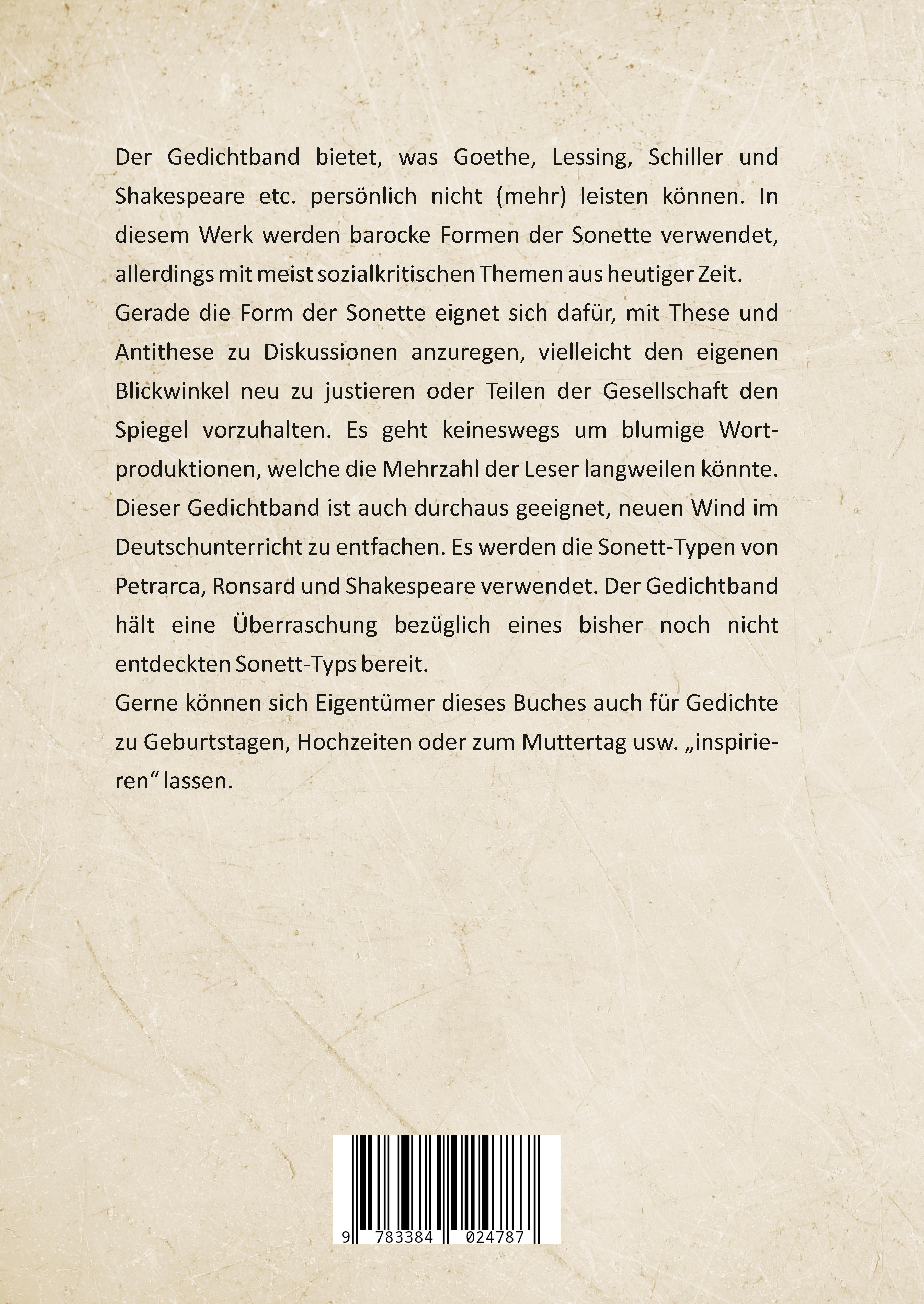 Der Gedichtband bietet, was Goethe, Lessing, Schiller und Shakespeare etc. persönlich nicht (mehr) leisten können. In diesem Werk werden barocke Formen der Sonette verwendet, allerdings mit meist sozialkritischen Themen aus heutiger Zeit. Gerade die Form der Sonette eignet sich dafür, mit These und Antithese zu Diskussionen anzuregen, vielleicht den eigenen Blickwinkel neu zu justieren oder Teilen der Gesellschaft den Spiegel vorzuhalten. Es geht keineswegs um blumige Wortproduktionen, welche die Mehrzahl der Leser langweilen könnte. Dieser Gedichtband ist auch durchaus geeignet, neuen Wind im Deutschunterricht zu entfachen. Es werden die Sonett-Typen von Petrarca, Ronsard und Shakespeare verwendet. Der Gedichtband hält eine Überraschung bezüglich eines bisher noch nicht entdeckten Sonett-Typs bereit. Gerne können sich Eigentümer dieses Buches auch für Gedichte zu Geburtstagen, Hochzeiten oder zum Muttertag usw. "inspirieren" lassen.