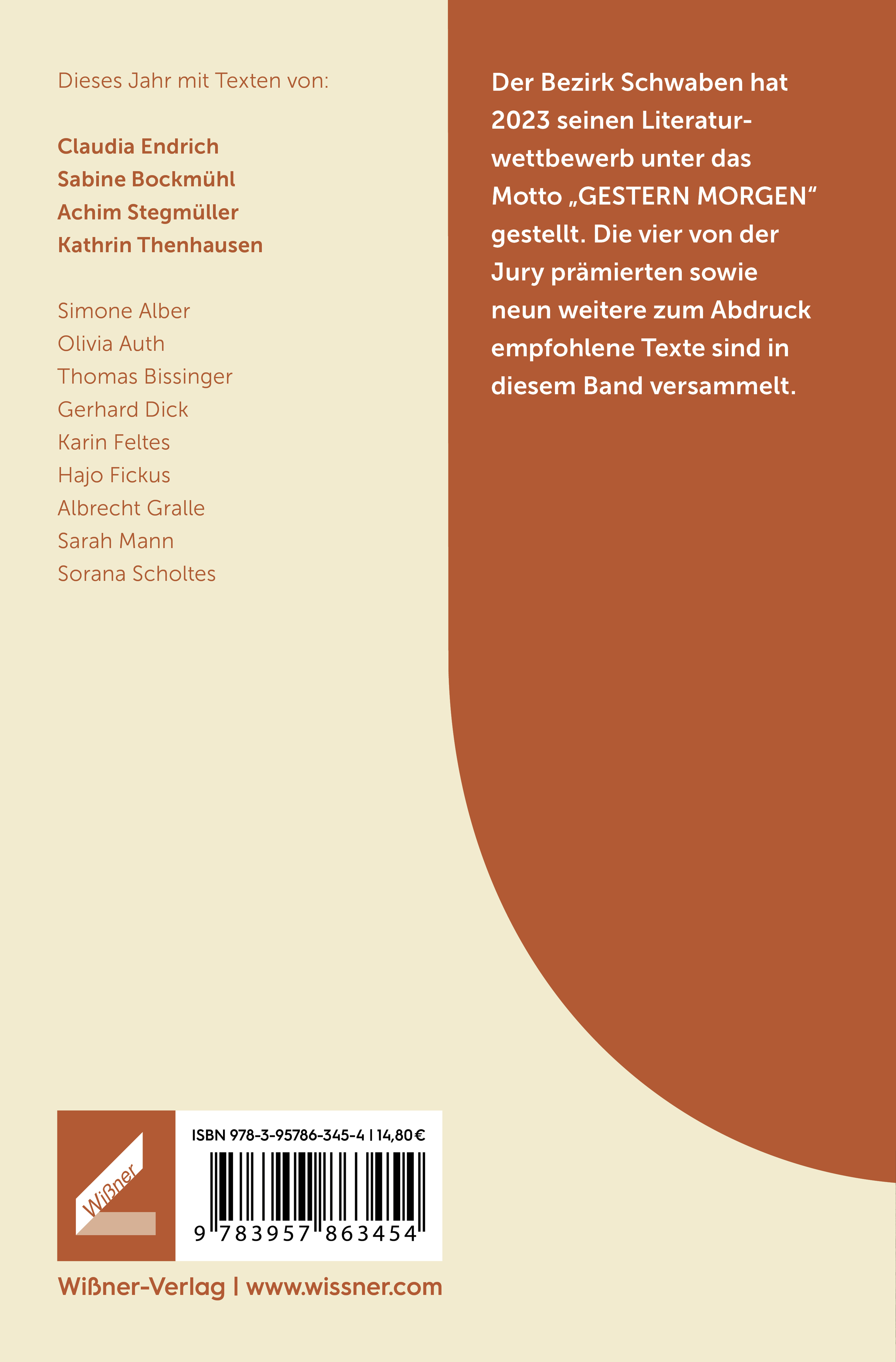 Der Bezirk Schwaben hat 2023 seinen Literaturwettbewerb unter das Motto "GESTERN MORGEN" gestellt. Die vier von derJury prämierten sowie neun weitere zum Abdruck empfohlene Texte sind in diesem Band versammelt.Dieses Jahr mit Texten von:Claudia Endrich, Sabine Bockmühl, Achim Stegmüller, Kathrin Thenhausensowie Simone Alber, Olivia Auth, Thomas Bissinger, Gerhard Dick, Karin Feltes, Hajo Fickus, Albrecht Gralle, Sarah Mann und Sorana Scholtes