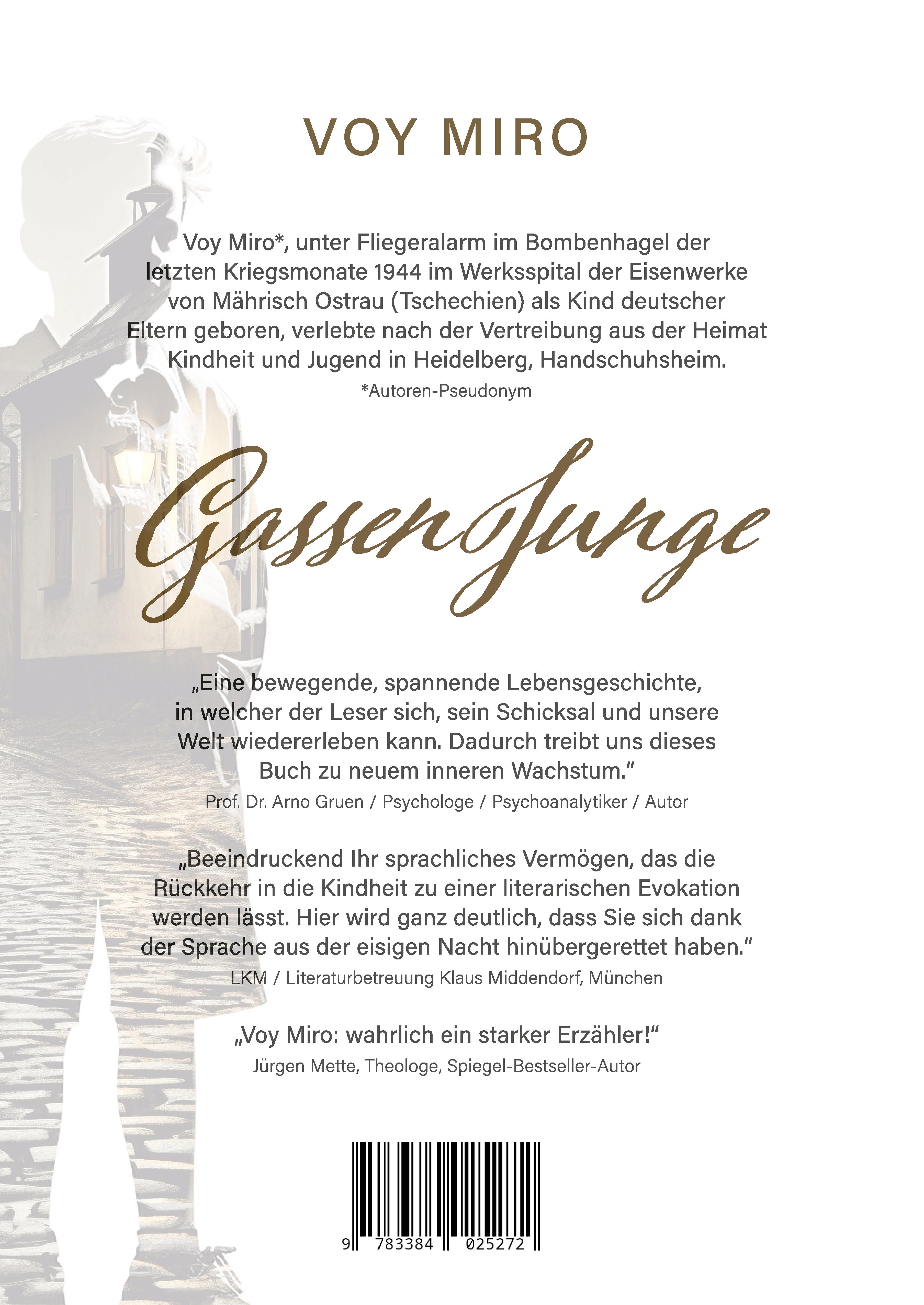 Voy Miro*, unter Fliegeralarm im Bombenhagel der letzten Kriegsmonate 1944 im Werksspital der Eisenwerke von Mährisch Ostrau (Tschechien) als Kind deutscher Eltern geboren, verlebte nach der Vertreibung aus der Heimat Kindheit und Jugend in Heidelberg, Handschuhsheim. *Autoren-Pseudonym "Eine bewegende, spannende Lebensgeschichte, in welcher der Leser sich, sein Schicksal und unsere Welt wiedererleben kann. Dadurch treibt uns dieses Buch zu neuem inneren Wachstum." Prof. Dr. Arno Gruen / Psychologe/ Psychoanalytiker/ Autor "Beeindruckend Ihr sprachliches Vermögen, das die Rückkehr in die Kindheit zu einer literarischen Evokation werden lässt. Hier wird ganz deutlich, dass Sie sich dank der Sprache aus der eisigen Nacht hinübergerettet haben." LKM / Literaturbetreuung Klaus Middendorf, München "Voy Miro: wahrlich ein starker Erzähler!" Jürgen Mette, Theologe, Spiegel-Bestseller-Autor Entdecken Sie mehr auf meiner homepage: manfred-poisel.de