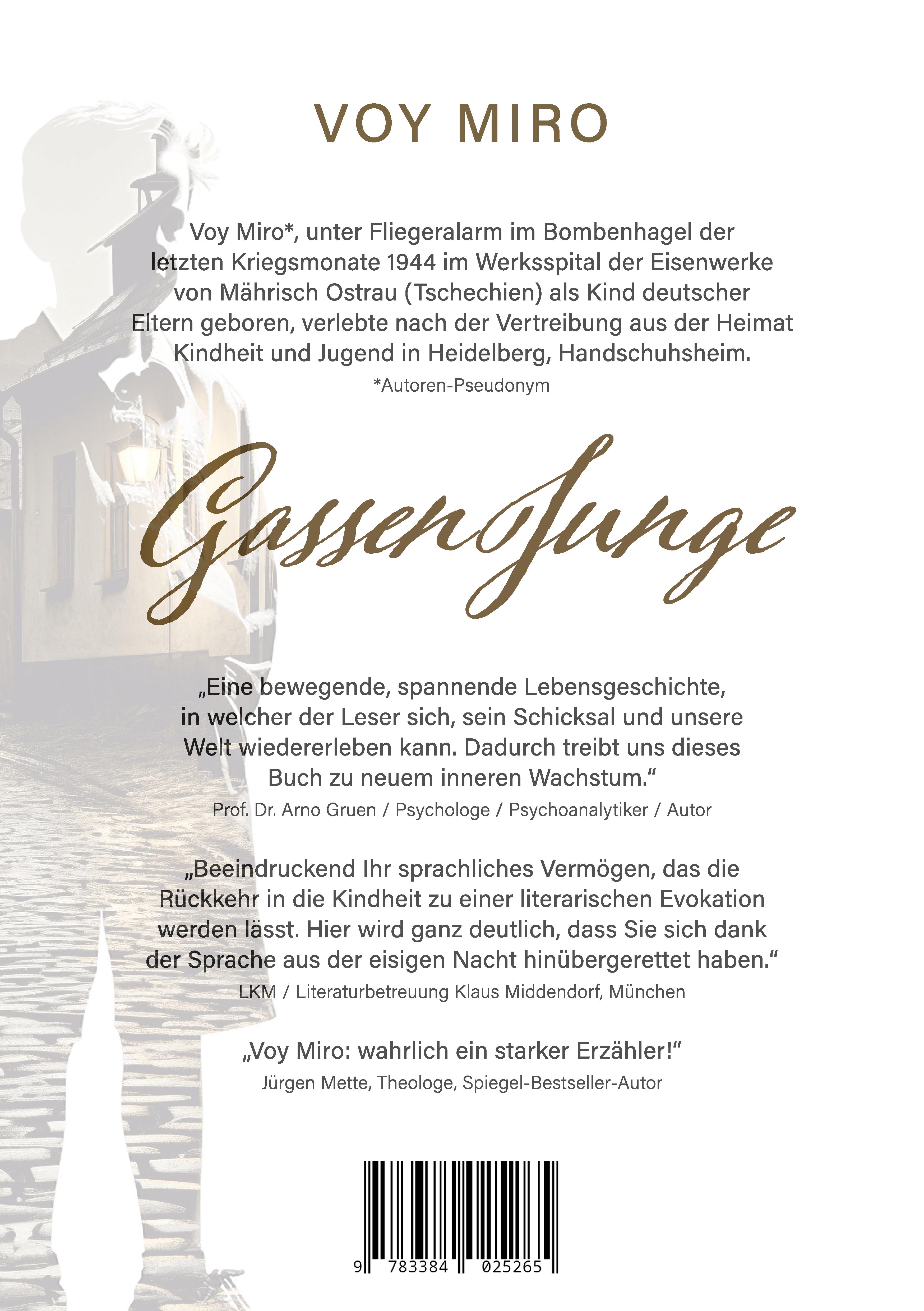Voy Miro*, unter Fliegeralarm im Bombenhagel der letzten Kriegsmonate 1944 im Werksspital der Eisenwerke von Mährisch Ostrau (Tschechien) als Kind deutscher Eltern geboren, verlebte nach der Vertreibung aus der Heimat Kindheit und Jugend in Heidelberg, Handschuhsheim. *Autoren-Pseudonym "Eine bewegende, spannende Lebensgeschichte, in welcher der Leser sich, sein Schicksal und unsere Welt wiedererleben kann. Dadurch treibt uns dieses Buch zu neuem inneren Wachstum." Prof. Dr. Arno Gruen / Psychologe/ Psychoanalytiker/ Autor "Beeindruckend Ihr sprachliches Vermögen, das die Rückkehr in die Kindheit zu einer literarischen Evokation werden lässt. Hier wird ganz deutlich, dass Sie sich dank der Sprache aus der eisigen Nacht hinübergerettet haben." LKM / Literaturbetreuung Klaus Middendorf, München "Voy Miro: wahrlich ein starker Erzähler!" Jürgen Mette, Theologe, Spiegel-Bestseller-Autor Entdecken Sie mehr auf meiner homepage: manfred-poisel.de