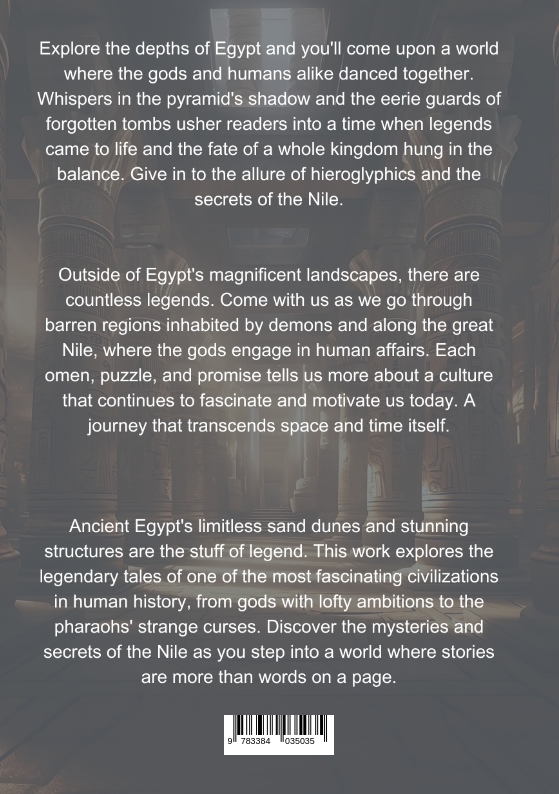 Explore the depths of Egypt and you'll come upon a world where the gods and humans alike danced together. Whispers in the pyramid's shadow and the eerie guards of forgotten tombs usher readers into a time when legends came to life and the fate of a whole kingdom hung in the balance. Give in to the allure of hieroglyphics and the secrets of the Nile.Outside of Egypt's magnificent landscapes, there are countless legends. Come with us as we go through barren regions inhabited by demons and along the great Nile, where the gods engage in human affairs. Each omen, puzzle, and promise tells us more about a culture that continues to fascinate and motivate us today. A journey that transcends space and time itself.Ancient Egypt's limitless sand dunes and stunning structures are the stuff of legend. This work explores the legendary tales of one of the most fascinating civilizations in human history, from gods with lofty ambitions to the pharaohs' strange curses. Discover the mysteries and secrets of the Nile as you step into a world where stories are more than words on a page.