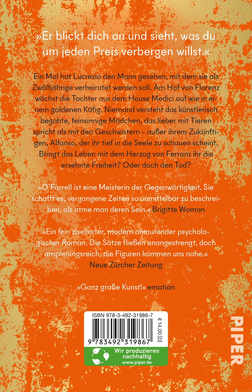 Ein Mal hat Lucrezia den Mann gesehen, mit dem sie als Zwölfjährige verheiratet werden soll. Am Hof von Florenz wächst die Tochter aus dem Hause Medici auf wie in einem goldenen Käfig. Niemand versteht das künstlerisch begabte, feinsinnige Mädchen, das lieber mit Tieren spricht als mit den Geschwistern - außer ihrem Zukünftigen, Alfonso, der ihr tief in die Seele zu schauen scheint. Bringt das Leben mit dem Herzog von Ferrara ihr die ersehnte Freiheit? Oder doch den Tod?