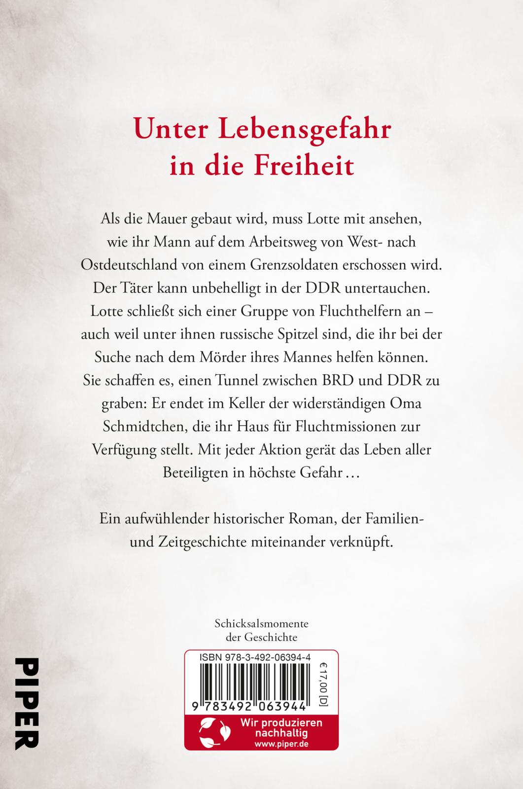 Als die Mauer gebaut wird, muss Gerda mit ansehen, wir ihr Mann auf dem Arbeitsweg von West nach Ost von einem Grenzer erschossen wird. Der Täter kann unbehelligt in der DDR untertauchen. Gerda schließt sich einer Gruppe von Fluchthelfern an - auch weil unter ihnen russische Spitzel sind, die ihr bei der Suche nach dem Mörder ihres Mannes helfen können. Sie schaffen es, einen Tunnel zwischen BRD und DDR zu graben, der im Keller der widerständigen Oma Schmidtchen endet, die ihr Haus für Fluchtmissionen zur Verfügung stellt. Mit jeder Aktion gerät das Leben aller Beteiligten in höchste Gefahr ...
