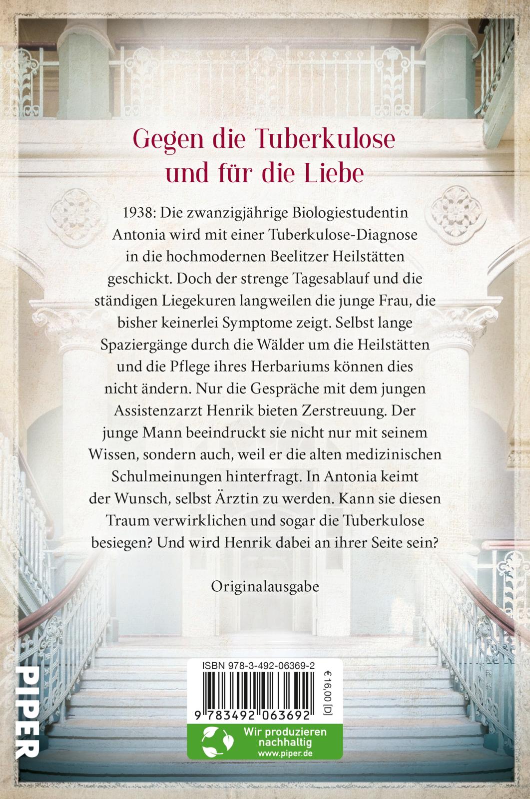 1938: Die zwanzigjährige Antonia wird mit einer Tuberkulose-Diagnose in die hochmodernen Beelitzer Heilstätten geschickt. Schnell geht es ihr besser, doch der strenge Tagesablauf und die ständigen Liegekuren sorgen dafür, dass die junge Frau sich alsbald langweilt. Nur die Gespräche mit dem jungen Assistenzarzt Henrik bieten Zerstreuung. Wenige Jahre später kehrt sie als angehende Ärztin für Lungenheilkunde nach Beelitz - und zu Henrik - zurück. Doch die Zeiten haben sich geändert, der Schatten des Nationalsozialismus liegt über dem gesamten Komplex. Finden Antonia und Henrik dennoch ihr Glück?