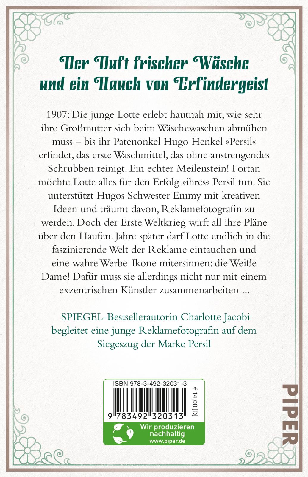 Berlin, 1922: Die junge Fotografin Lotte arbeitet an einem Projekt, das ihr besonders am Herzen liegt. Schon als Kind sah sie, wie sich ihre Oma beim Wäschewaschen abmühte. 1907 machte ihr Patenonkel Hugo Henkel dann eine bahnbrechende Entdeckung: »Persil« war das erste Waschmittel, das ohne Schrubben reinigt. Nun möchte Lotte alles für den Erfolg »ihres« Persil tun. In der faszinierenden Welt der Reklame erhält sie die Chance, bei der Schaffung einer Werbe-Ikone dabei zu sein: der weißen Dame. Dafür muss sie mit einem Künstler arbeiten, der für Furore sorgt - und Lottes Leben durcheinanderwirbelt.