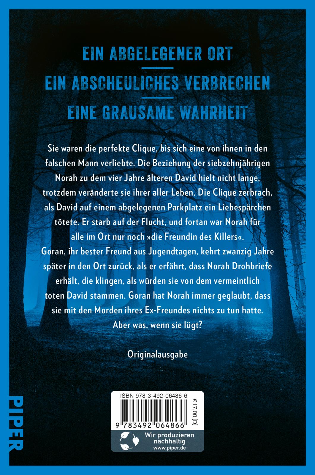 Sie waren die perfekte Clique, bis sich eine von ihnen in den falschen Mann verliebte. Die Beziehung der siebzehnjährigen Norah zu dem vier Jahre älteren David hielt nicht lange, und nach der Trennung wurde David zum Mörder. Er tötete ein Liebespaar auf einem abgelegenen Parkplatz und kam dann auf der Flucht ums Leben. Für die Bewohner des abgelegenen Ortes war Norah fortan nur »Die Freundin des Killers«. Knapp zwanzig Jahre später kehrt Goran, Norahs bester Freund aus Kindertagen, nach Waldesroda zurück, als er erfährt, dass Norah Drohbriefe erhält, die klingen, als würden sie vom verstorben geglaubten David stammen. Um herauszufinden, was dahintersteckt, muss Goran in die Vergangenheit abtauchen. In Norahs, aber auch in seine eigene.